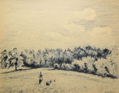 0370-Willi Schabbon, Blumenpflückende Mädchen auf der Wiese, Bleistiftzeichnung, gerahmt
