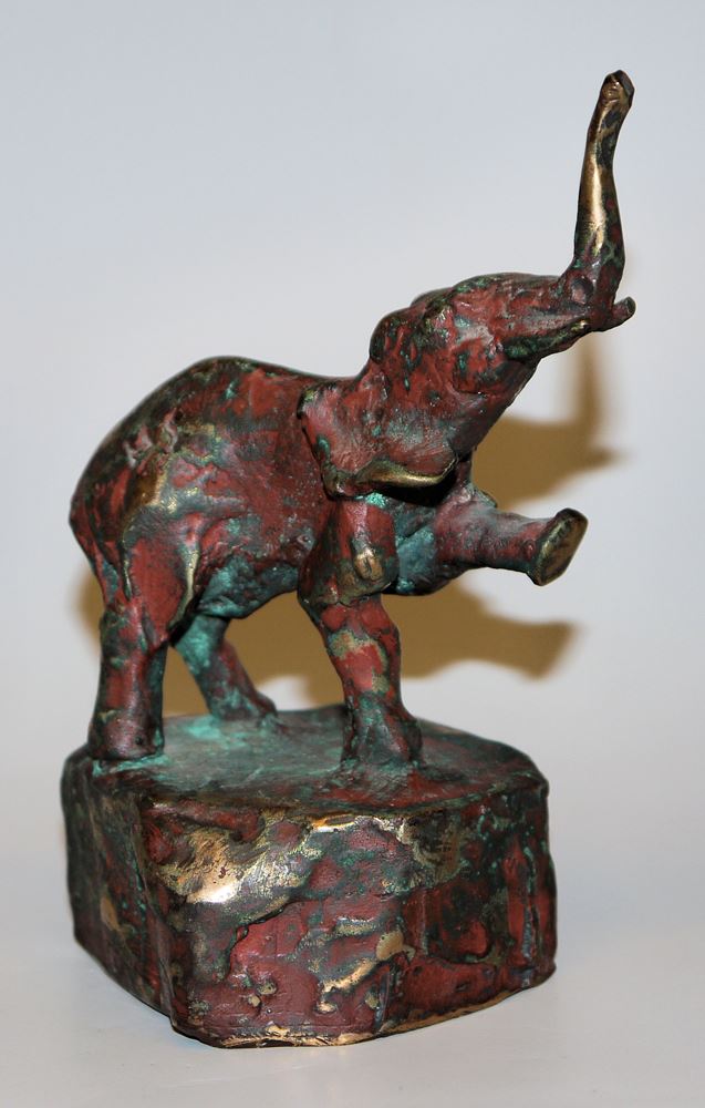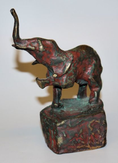 Hans Schröder, 1930 - Saarbrücken - 2010, deutscher Bildhauer und Maler, hier: Junger Elefant, das rechte Bein hebend und trompetend, Bronze kaltbemalt, mit schöner Alterspatina, 8 x 8 x 15 cm, rückseitig monogr. H.S
