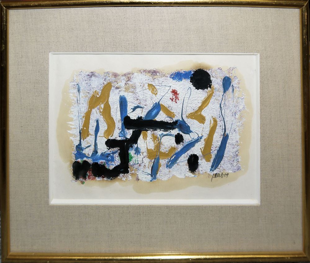 Fritz Winter, Ohne Titel, signiertes Ölgemälde von 1959 Fritz Winter, 1905 Altenbögge/Westf - 1976 Herrsching/Ammersee, Abstrakte Komposition, Öl/Papier, teils pastoser Farbauftrag, 24,2 x 17,2 cm, signiert, datiert (19)59, verso zwei Etiketten Galerie Marbach, Bern mit Artikelnummer sowie Etikett IKI - Internationaler Markt für aktuelle Kunst '74 Düsseldorf, unter Glas und P.p. gerahmt, Provenienz: Privatsammlung Heidelberg Zum Künstler: Fritz Winter bewarb sich 1927 beim Staatlichen Bauhaus in Dessau. Von Paul Klee unterzeichnet, erhielt er die Aufnahmebestätigung für die Grundlehre des Wintersemesters 1927/28. Seine Professoren im ersten Studienjahr waren u. a. Josef Albers und Wassily Kandinsky. 1937 wurde in der Nazi-Aktion „Entartete Kunst“ aus dem Provinzial-Museum Hannover sein Aquarell „Ein Kopf“ und aus dem Museum für Kunst und Gewerbe Hamburg sein Tafelbild „Komposition“ (Öl auf Papier, 1931) beschlagnahmt und vernichtet. Gründungsmitglied der Künstlergruppe „ZEN 49“ in München; sein Haus wurde zu einem lebendigen Treffpunkt der aktuellen Kunstszene. 1950 begegnete er Hans Hartung und Pierre Soulages in Paris.