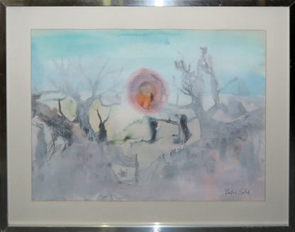 Pieter Sohl, Magische Sonne & Expressive Stadtarchitektur, zwei größere Mischtechniken von 1970, beide gleich gerahmt