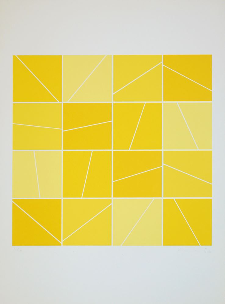 0393-Klaus Staudt, Geometrische Formen in Gelb, konkrete Kunst, signierte Farbserigraphie von 1970