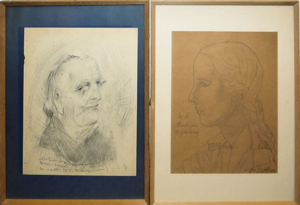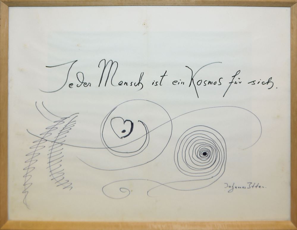 Franzsepp Würtenberger, Nachlass des Künstlers mit Zeichnungen, Kunstkonzepten, Fotografien, Monographie sowie einer Original Zeichnung von Johannes Itten Franzsepp Würtenberger, 1909 Zürich - 1998 Karlsruhe, deutscher Kunsthistoriker, Nachlass des Künstlers mit einer Original Tintenzeichnung von Johannes Itten (1888 Wachseldorn - 1967 Zürich), "Jeder Mensch ist ein Kosmos für sich." 29,5 x 39,5 cm, handsigniert, Blatt mit Mittelfalz, unter Glas gerahmt, dazu 15 Fotografien, Kunstkonzepte, Artikel, Entwürfe für Museen und Zeichnungen, teils vom Künstler bezeichnet, alle gleich gerahmt (42 x 31 cm), dazu Monographie "Das Ich als Mittelpunkt der Welt", von Franzsepp Würtenberger, Karlsruhe 1986 Zum Künstler: Zunächst erwog er Maler zu werden, nahm dann aber ein Studium der Kunstgeschichte auf, 1930 in Freiburg, 1931 in Wien, 1931 in München. 1932 ging er wegen Erwin Panofsky nach Hamburg, 1932 studierte er in Karlsruhe, und bis 1935 wieder in Freiburg, wo er promovierte. 1937 erhielt er ein Stipendium an der Bibliotheca Hertziana in Rom. 1938 war er Assistent an die Universität Graz, wo er ab 1943 lehrte. Unter dem Eindruck des 1948 veröffentlichten Buches „Verlust der Mitte“ von Hans Sedlmayr begann Würtenberger einen neuen Anlauf zur wissenschaftlichen Arbeit. An der Außenstelle Freiburg der Staatlichen Akademie der Bildenden Künste Karlsruhe wurde Würtenberger 1949 Dozent und mitgegründete „fragmente-Gruppe“. 1951 kam Würtenberger an das Institut für Baugeschichte der Technischen Hochschule Karlsruhe, als dessen Direktor sein Freiburger Freund Arnold Tschira berufen worden war und wo er später außerplanmäßiger Professor wurde.
