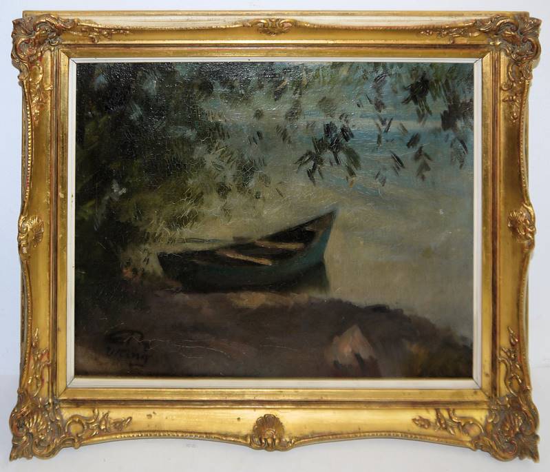 Eduard Thöny, 1866 Brixen - 1950 Holzhausen/Ammersee, österreichischer Zeichner, Karikaturist (Simplicissimus) und Maler, hier: Ruderboot am Ufer unter einem Baum liegend, Öl/Lw, 39,5 x 49,5 cm, stärkere Craqueluren, monogram. u. betitelt, verso handschriftlich bez. u. betit., im Goldrahmen