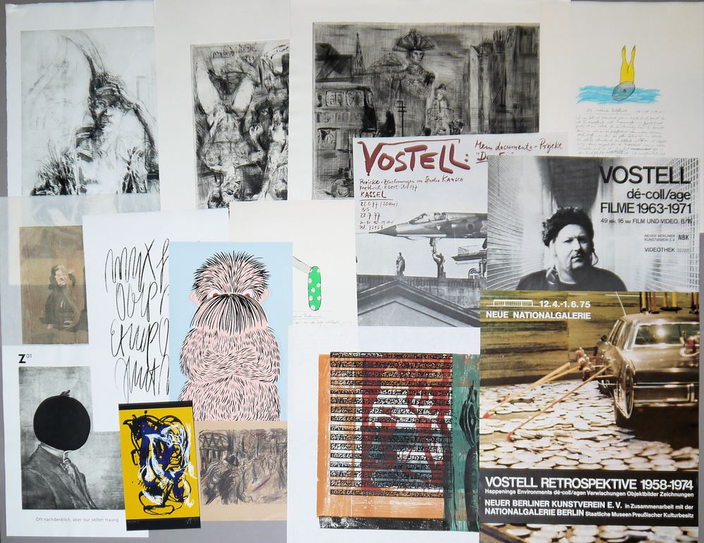 35 Arbeiten: Heike Kati Barath, *1966, Ohne Titel, Siebdruck, 2015; Wilhelm Beuermann, 1937-2006, 2 Kompositionen, Farbserigraphien; Friederike Feldmann, *1962, Typografie 1, Litho, 2015; Hubertus Giebe, *1953, "Ich habe seinen Ständer gesehen" und "In London mit Nelson", 2 Radierungen, sign. u. bez.; Ulrich Hachulla, *1943, "Selbstbildnis im Radierkittel", Radierung, sign.; Jana Gunstheimer, *1974, Irrige Vorstellungen kausaler Zusammenhänge A-Z, Oft nachdenklich, aber nur selten traurig, Aquatinta, 2015; Gudrun Höritzsch, 1961, Komposition, Farbsiebdruck, 1991; Werner Knaupp, *1936, "Vernarbung" und o.T., 2 Lithographien, 1975; Christian Lang, *1953, 3 Farbradierungen, 1990/92; Uwe Lindau, 1950-2022, Für Nina, Farblitho von 1992, sign.; Gosia Machon, *1979, "Alchemistische Pfütze", Aquatinta, 2015; Joan Miro, Ausstellungsplakat Artema Barcelona 1980, Offset; Giuseppe Santomaso, 1907-1990, o.T., Farblitho, 1970; Fritz Schwegler, 1935-2014, "Die sinkende Bettflasche" und "Das Silbergrüne Taschenmesser, Farblithographien, 1970, Ed. Staeck; Pierre-Yves Trémois,1921-2020, Akt mit Oktopus, Radierung, 1971; Unleserlich signierend, 4 expressive Kompositionen, Gouachen/ Papier, von 1974/75/ 82/ 83; Wolf Vostell, 1932-1998, Vostell-Desasters 1972, "Mein Documenta-Projekt: "Das Ei"" 1977, Retrospektive 1958-75 und Vostell dé-coll/age Filme 1963-7, 4 Plakate, Offset; Werner Wittig, 1930-2013, "Kleine Vase", Zinkographie, sign. u.a.