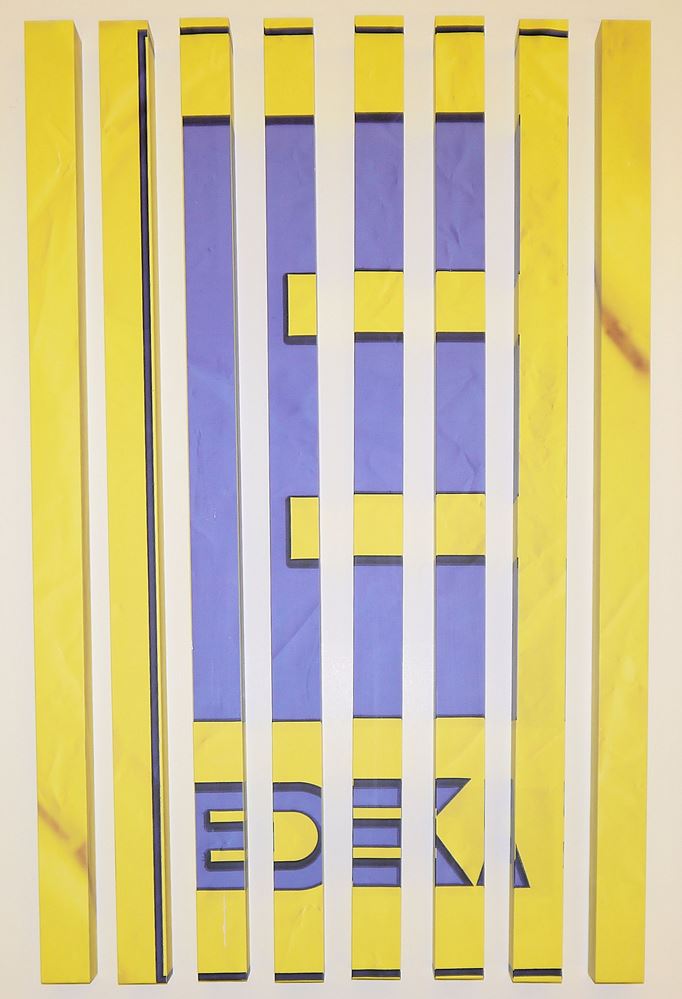 Dennis Loesch, EDEKA, Wandobjekt, Inkjet-Print auf Aluminiumstäben von 2014 Dennis Loesch, *1979 Frankfurt, 2001-06 Studium an der Städelschule in Frankfurt, lebt und arbeitet in Berlin und Hamburg, hier: EDEKA, Wandobjekt, Inkjet-Print auf Aluminiumstäben, 100 x 96 x 4 cm, verso signiert, bezeichnet Berlin und datiert 2014, einmal Farbabrieb am unteren Rand