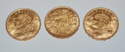 3 x 20 Franken, 900er Gold, 6,44 /6,45 / 6,47 g (zus. 19,32 g), Dm 21,1 cm, Vs. Porträt der Vreneli vor Gebirgshintergrund, Rs. Schweizer Wappen