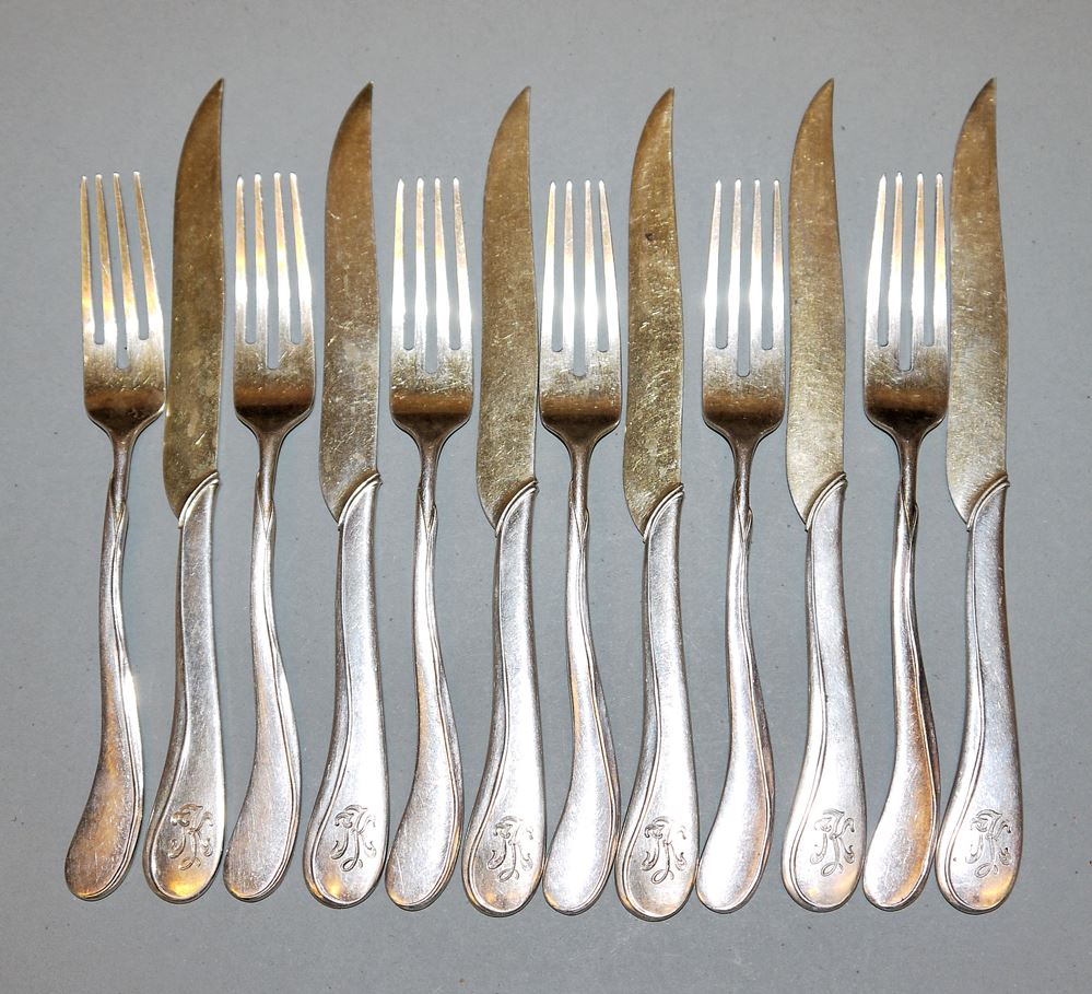 Johann Heinrich Vogeler, 1872 Bremen - 1942 im Kolchos Budjonny bei Kornejewka, Karaganda, Kasachische SSR, deutscher Maler, Grafiker, Architekt, Designer, Pädagoge, Schriftsteller und Sozialist, hier: 800er Silber, 12-tlg., 6 Dessert- / Obstgabeln und 6 Dessert-/Obstmesser, Entwurf 1898/98, zus. 323 g