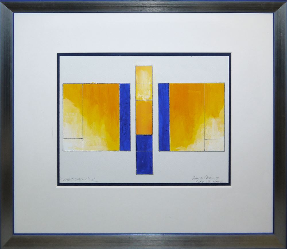 Karl Vogelsang, Meerlandschaft und abstrakte Komposition, 2 signierte Gouache, galeriegerahmt Karl Vogelsang, 1932 Essen - 2006 Kronberg i. Taunus, Meerlandschaft, Gouache/Papier, 40 x 30 cm, signiert, unter Glas u. P.p. gerahmt und "Message", Gouache, 22,5 x 30,5 cm, signiert, datiert 24.12.2002, unter Glas und P.p. galeriegerahmt Zum Künstler: Karl Vogelsang studierte von 1952 bis 1954 zunächst Malerei an der Akademie in Bonn bevor er für ein Jahr an die Hochschule für Bildende Künste nach Hamburg zu der Textildesignerin Maria May wechselte, die zu einer Art Mentorin des Künstlers wurde und ihn mit einem seiner ersten Klienten, den Vereinigte Werkstätten, bekannt machte. Nach einer Tätigkeit im Atelier Thominet in Paris setzte Vogelsang sein Studium an der Hochschule für Bildende Künste in Berlin fort. Nach seinem Abschluss im Jahr 1961 war Vogelsang zwei Jahre für die Textilfirma Christoph Andreae in Viersen tätig. Ab dem Jahr 1963 arbeitete er als freier Designer und Maler im Studio Gallery Beletage in Düsseldorf und entwarf zahlreiche Textildesigns für die Firmen Heberlein & Co. AG, Taunus Textildruck, Rothirst, und JAB Anstoetz. Im Gegensatz zu seinen farbenfrohen Textilentwürfen sind die Gemälde der 1980er Jahre von einer dunklen Farbpalette bestimmt. Vogelsang verarbeitete in seiner Malerei den herben Schlag, den er durch den Tod seines Sohnes erlitten hatte. Erst nach der Eheschließung mit der Künstlerin Karin Vogelsang und einen Umzug nach Kronberg hellt sich seine Farbpalette auf und die düstere Atmosphäre seiner Ölgemälde wich einer leuchtenden Farbigkeit und sanft ineinander verlaufenden Farbflächen.