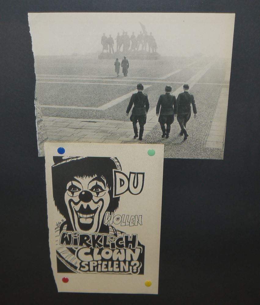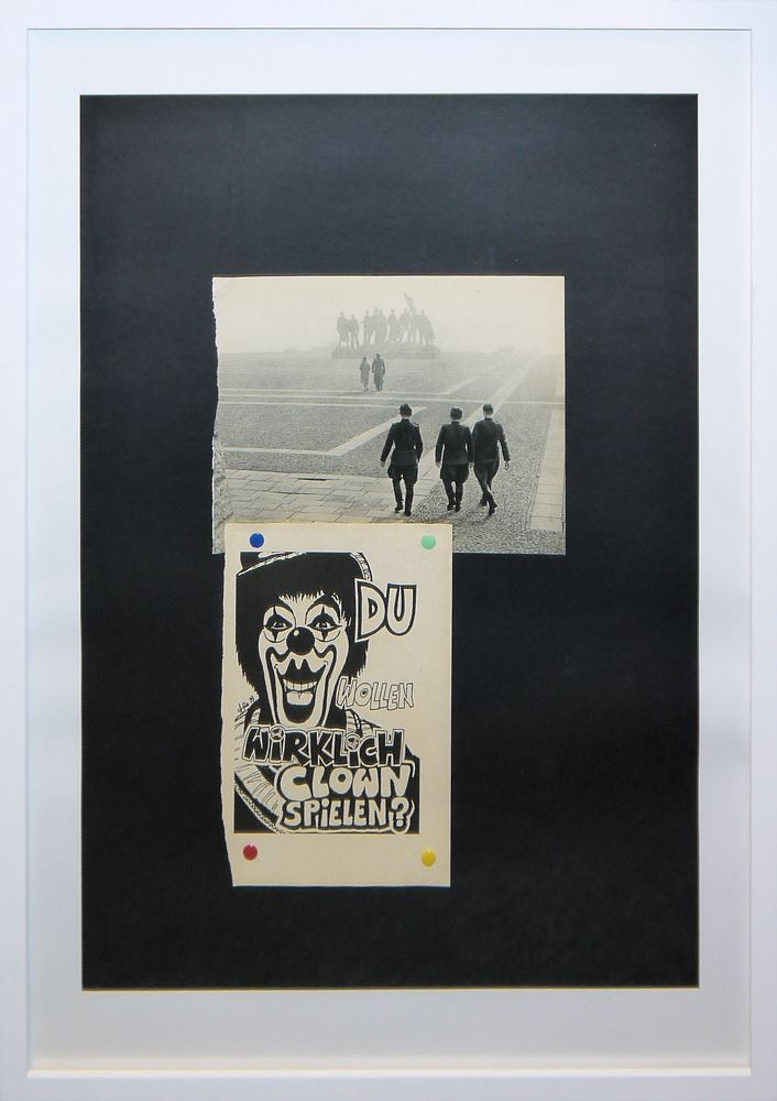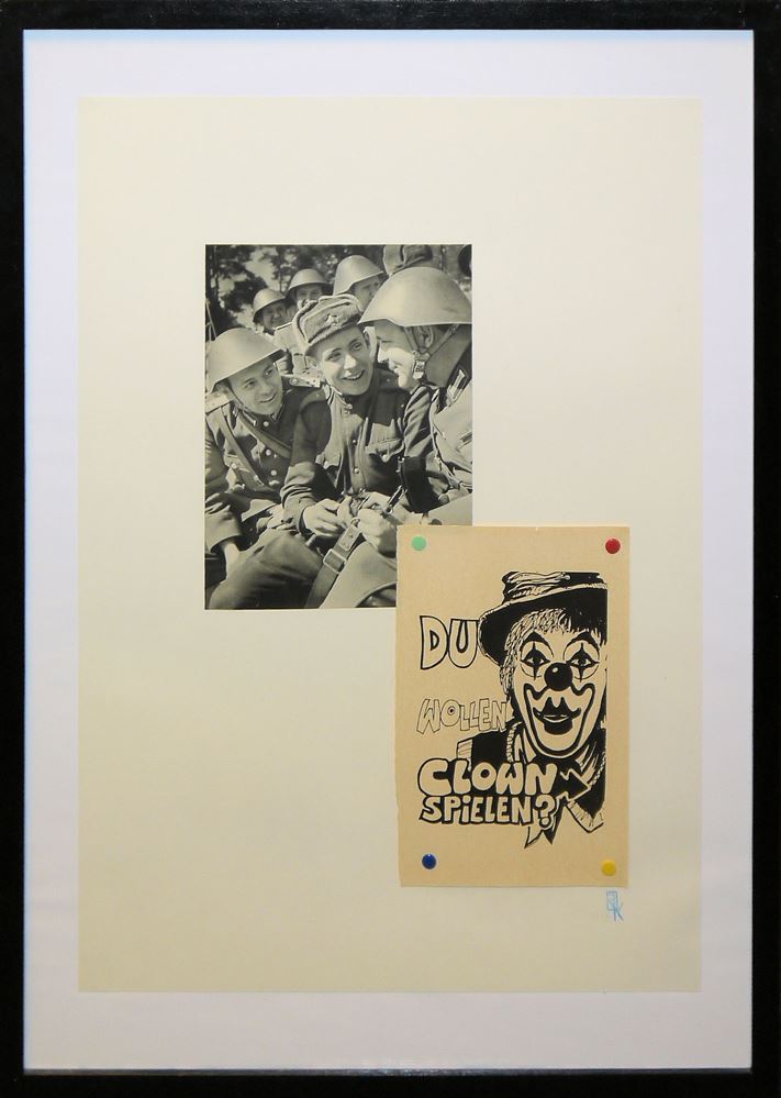 Oliver Kroll, "Du wollen Clown spielen", 2 Collagen von 2008 Oliver Rodriguez-Kroll, *1971 Hamburg, "Du wollen Clown spielen", 2 Collagen je mit Clownsplakat mit vier bunten Reißnägeln befestigt und im Kontrast dazu schwarz-weiß Fotografie mit Soldaten, aus der Ausstellung "Zirkus Stalin/Zirkus Hollywood", Größe mit Rahmen 72,5 x 53 cm, einmal gestempelt, unter Glas gerahmt Zum Künstler: Maler und Bildhauer. Er beschäftigt sich vor allem mit den dunklen Seiten der menschlichen Existenz. Geschichten von Tätern, Opfern, Mitläufern ... In seinem Bestreben, den alltäglichen Wahnsinn künstlerisch zu entdämonisieren, entdeckt er immer wieder Neues: von Sturmtruppen aus der Star Wars-Saga über antike Zinnsoldaten bis hin zu ausrangierten Lifestyle-Magazinen und verblassten Plakaten. All dies dient ihm als Inspiration, Vorlage oder Material für Collagen; es veranlasst ihn, der allgegenwärtigen Banalisierung sozialer Themen in der heutigen Zeit mit Ironie zu begegnen. Gleichzeitig sind bestimmte Werke eine bewusst naive Art, mit traumatisierenden Erfahrungen umzugehen, seien es seine eigenen oder die anderer, um sie sowohl für sich selbst als auch für den Betrachter erträglicher zu machen. Einfache Farben und Formen dominieren diese Gemälde und Collagen. Anstatt den erlebten Stress auszustrahlen, vermitteln die großen, aber dennoch zurückhaltenden Werke ein Gefühl von Ruhe und Ordnung. Oliver Rodriguez-Kroll wurde 1971 in Hamburg geboren. Nach mehreren Jahren in London und Paris lebt und arbeitet er seit 1999 in Berlin.