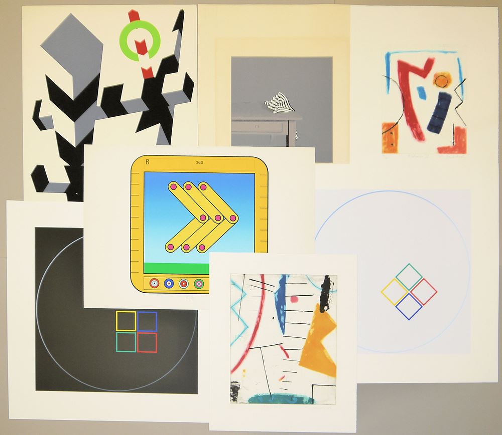 Allan d`Arcangelo, 1930 Buffalo - 1998 New York, Abstrakt, Farbsiebdruck Olympia München 1972, drucksign. & dat. 1970 // Friedrich Geiler, *1946 Bühl, Quadrate im Kreis, zwei Farbsiebdrucke, 76/90 & 71/90, je sign. & dat. 94 // Peter Nagel, *1941 Kiel, Gestreiftes Tuch auf Tisch, großer Farbsiebdruck, 160/200, sign. u. dat. 69 // Werner Nöfer, *1937 Essen, "360", Farbsiebdruck, 82/100, sign. u. dat. 71 // Eckhart Schädrich, *1950 Herrsching, "Markossa IV & Markossa VII", 2 große Farbradierungen, 9/85 & 11/85, je sign.