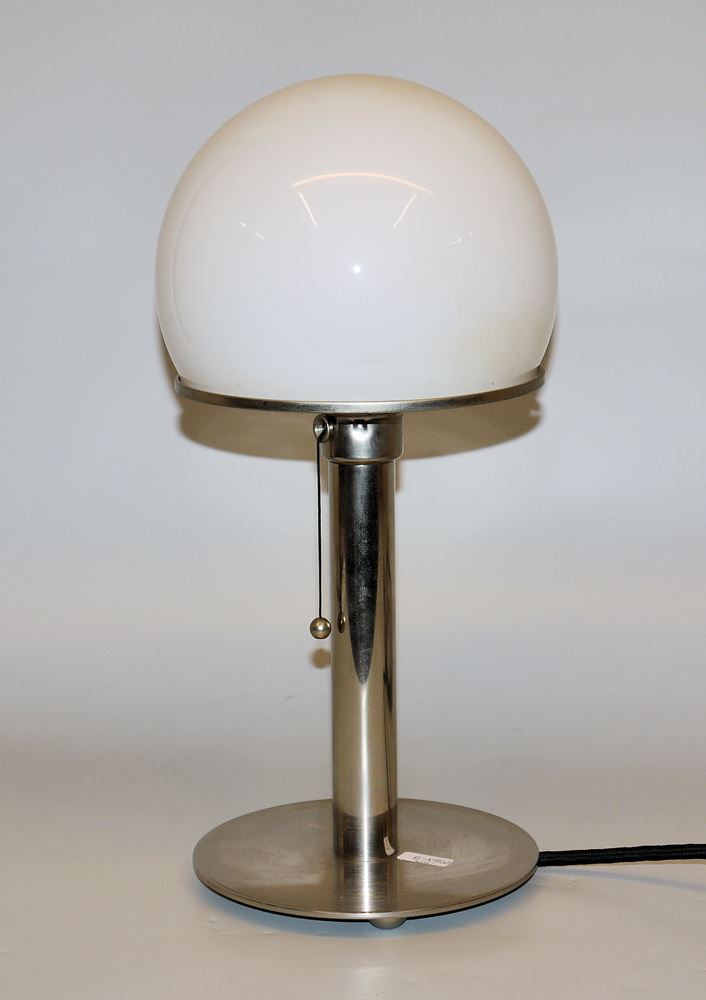 Entwurf Wagenfeld und Jucker 1924, die Bauhaus-Tischlampe WG24, erste Version mit matt vernickeltem Metallfuß und Milchglasschirm, Re-Edition von Tecnolumen, Serien-Nr. 19883, funktionsfähig, Elektrifizierung nicht geprüft, H 37 cm, Dm 18 cm