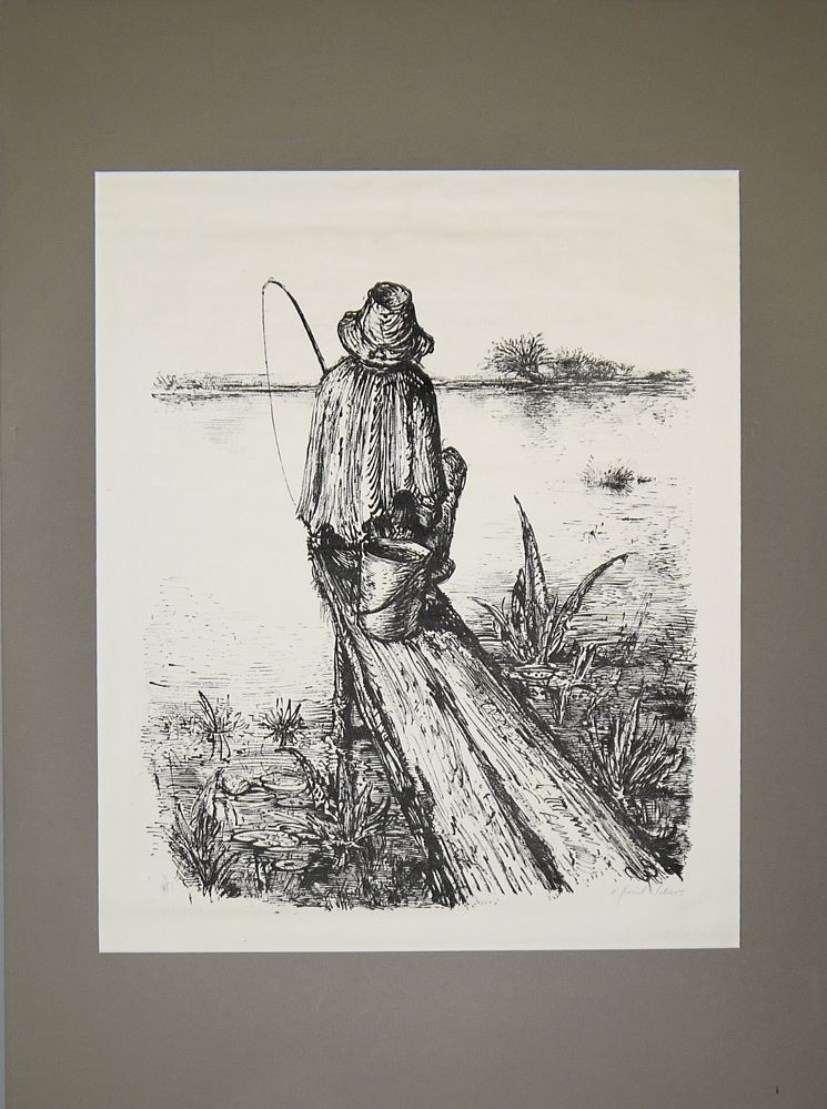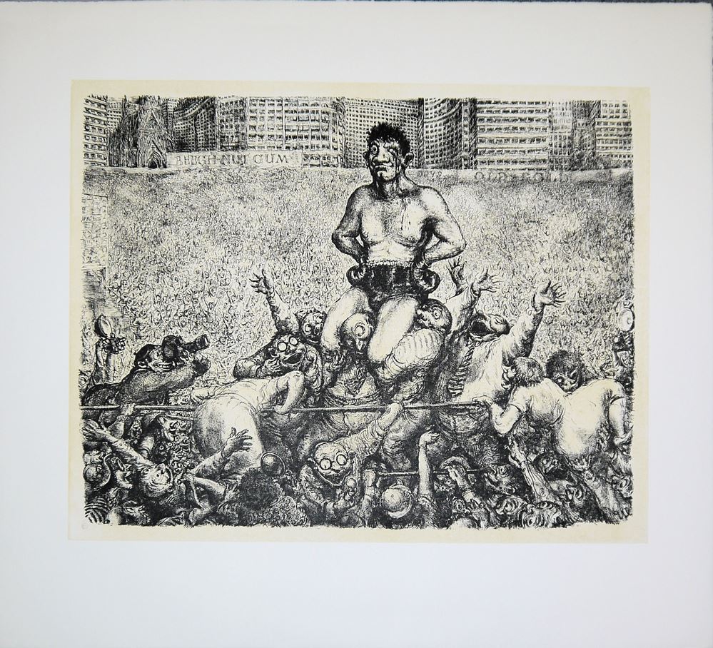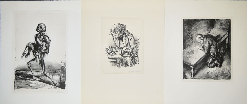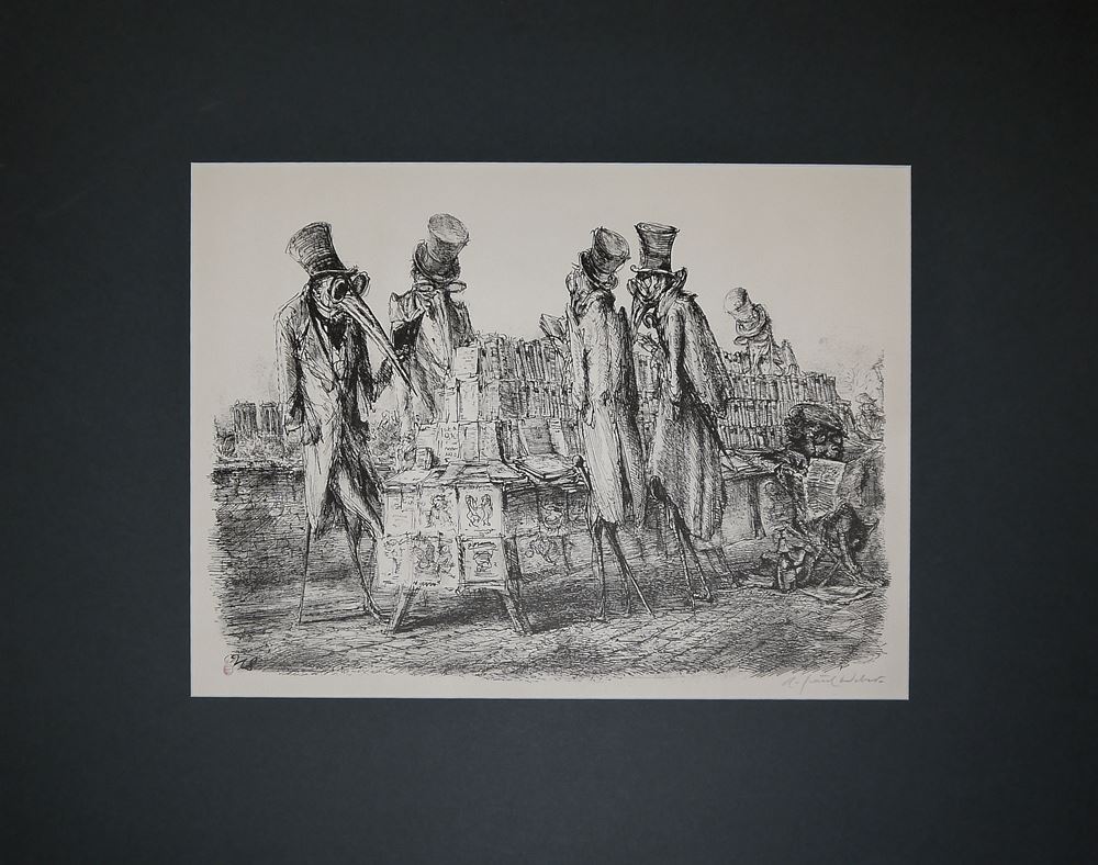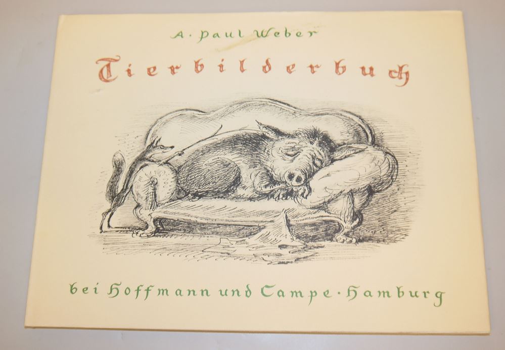 Andreas Paul Weber, "Der Angler" 1951, "Liebling der Menge" 1955, "Beim Bouquiniste am Quai Voltaire" 1961, "Der Gefangene" 1966, "Unsterblicher Kasper" 1971, "Der Schachspieler" 1976, 4 sign. Lithographien & A. Freiherr v. Knigge, Über Umgang mit Menschen m. sign. Lithographie, 1974 sowie 2 x Tierbilderbuch, einmal signiert und einmal mit sign. Lithographie Andreas Paul Weber, 1883 Arnstadt - 1980 Schretstaken bei Mölln, Maler, Lithograph, "Der Angler", Lithographie, 45 x 40 cm, sign., hinter P.p.; "Liebling der Menge", Lithographie, 45 x 61, 5 cm; "Beim Bouquiniste am Quai Voltaire", Lithographie, 31 x 48,3 cm, sign., hinter P.p.; "Der Gefangene (mit sich selbst)", Lithographie, 40 x 33 cm, sign.; "Unsterblicher Kasper", Lithographie, 51 x 35 cm, sign.; "Der Schachspieler", Lithographie, 34 x 26 cm. sign., alle o. Rahmen, dazu Adolph und Freiherr Knigge, Über den Umgang mit Menschen. Mit Zeichnungen von A. Paul Weber, Concept Vlg., Düsseldorf 1974, Vorzugsausgabe mit Original-Lithographie, 3 Herren, 24 x 16,5 cm, sign., num. 102/150, im Leinenkasten; 2 x A. Paul Weber, Tierbilderbuch, 52 Abbildungen nach Lithographien, m. Einl. v. G. Nicolini, Hoffmann & Campe, 1974, einmal Vorzugsaugabe mit Original-Lithographie, Hai beim Fischen, 16 x 26 cm, sign. u. num. 119/175, um Schuber, einmal Buch vom Künstler sign., im Umschlag,