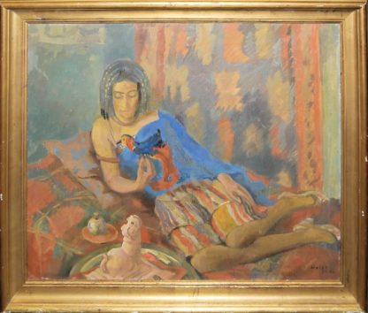 0436-Emil Rudolf Weiss, Junge Frau mit einem Papagei auf einem Diwan liegend, Ölgemälde von 1926, gerahmt