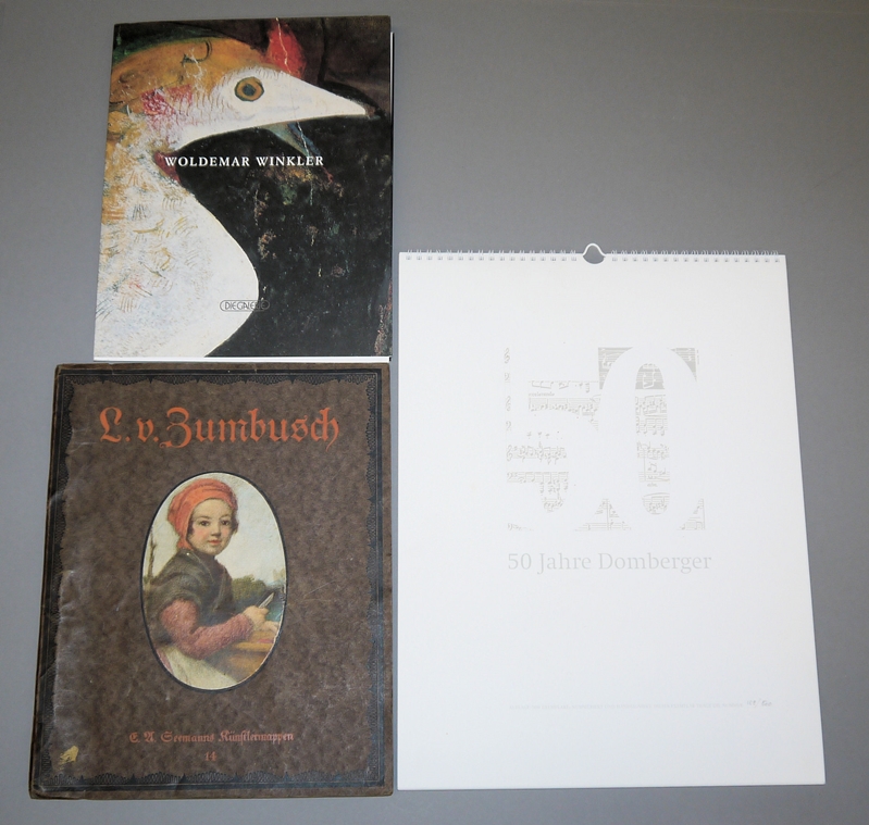 U.a. Atalanta (=Wolfgang Glöckler), Jonas Hafner (Griffelkunst), Katsuhoto Nishikawa (Griffelkunst), Svato Zapletal/René Char, A.T. Mörstedt/René Char, Trudi Demut, Raymond Waydelich, Yi Soon-Joo, Bernd Finkeldei, Vadim Zakharov (Griffelkunst), Maurelio Minuzzi, Richter, Meyring, Rainer Wölzl, Ehrenberg, Jürgen Schilling, Helmut Rieger, Armin Müller-Stahl, Lanoe, Heinz Friedrich, Merry Pierce Lowrey, Rudolf Schmid, Klaus Fresenius, Middendorf (Plakat, signiert), Peter Herrmann, Gabriele Langendorf, Schäfer, 50 Jahre Domberger Jubiläumskalender 2000, Katalog Woldemar Winkler, Künstlermappe 14: Ludwig von Zumbusch, versch. Techniken, alle o. Rahmen
