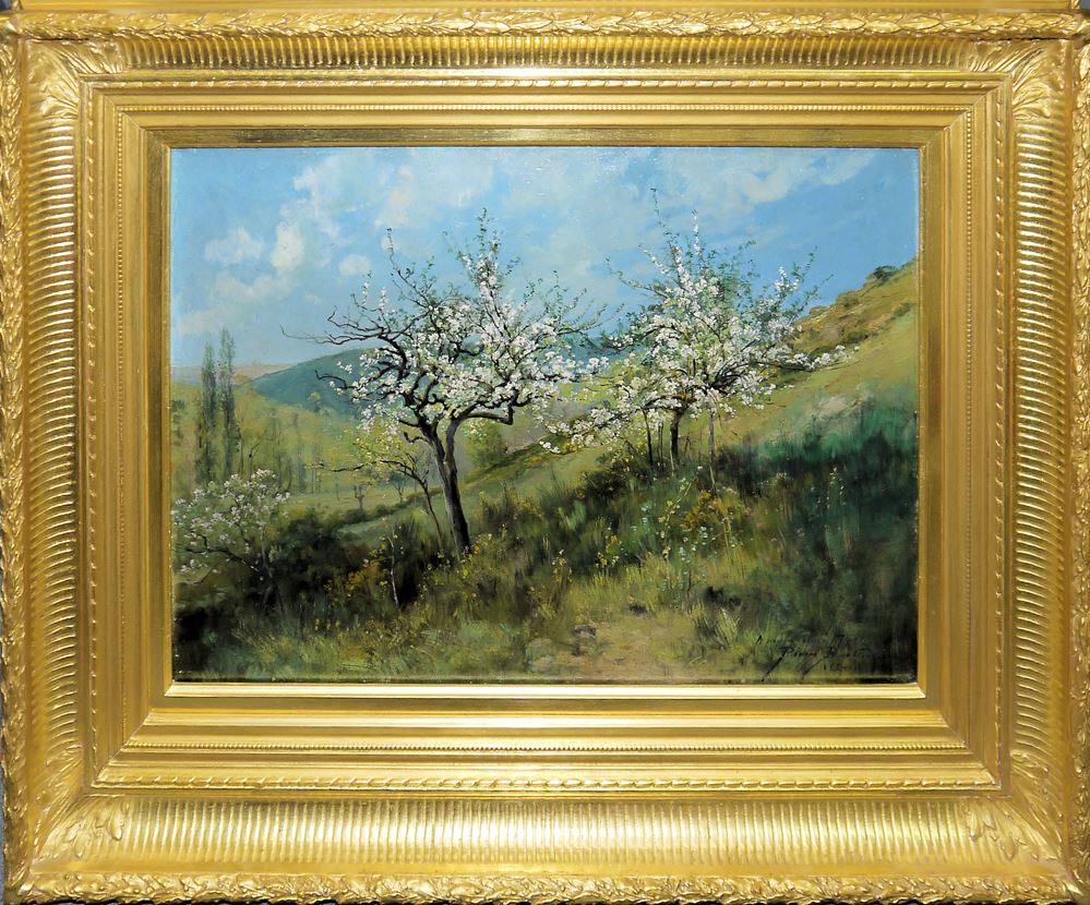 0443-Pierre Ernest Ballue, Blühende Obstbäume im Frühling (Arbres fruitiers en fleurs au printemps), Ölgemälde um 1900, prächtig gerahmt