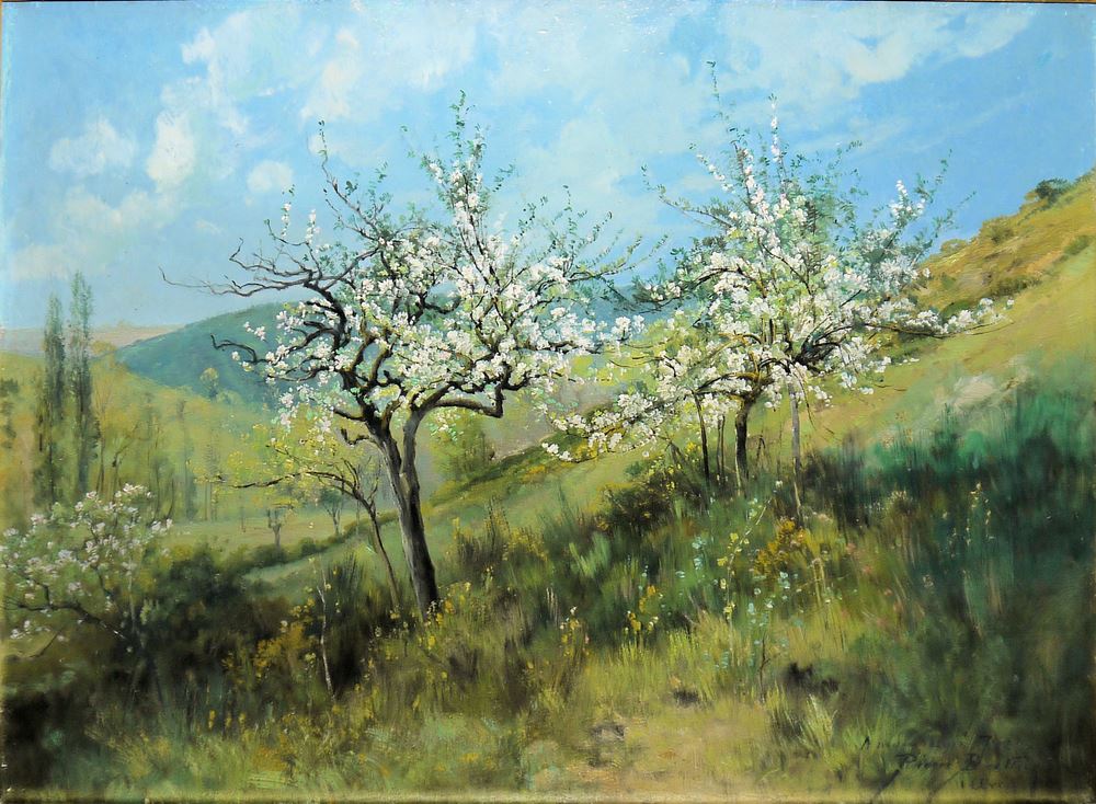 Pierre Ernest Ballue, 1855 - La Haye-Descartes/ Region Centre-Val de Loire - 1928, französischer Landschaftsmaler der Barbizon Schule und Schüler von Jean-Baptiste Camille Corot (1796 - Paris - 1875), hier: An einem sanften Wiesenhang stehen Obstbäume in der Frühlingsblüte, über ihnen spannt sich ein wolkenblauer Himmel, Öl/Holz, 42 x 60 cm, l. u. französisch ortsbez. sowie "....Avril" & signiert, im prächtigen Goldstuckrahmen (Gesamt: 60 x 80 cm)