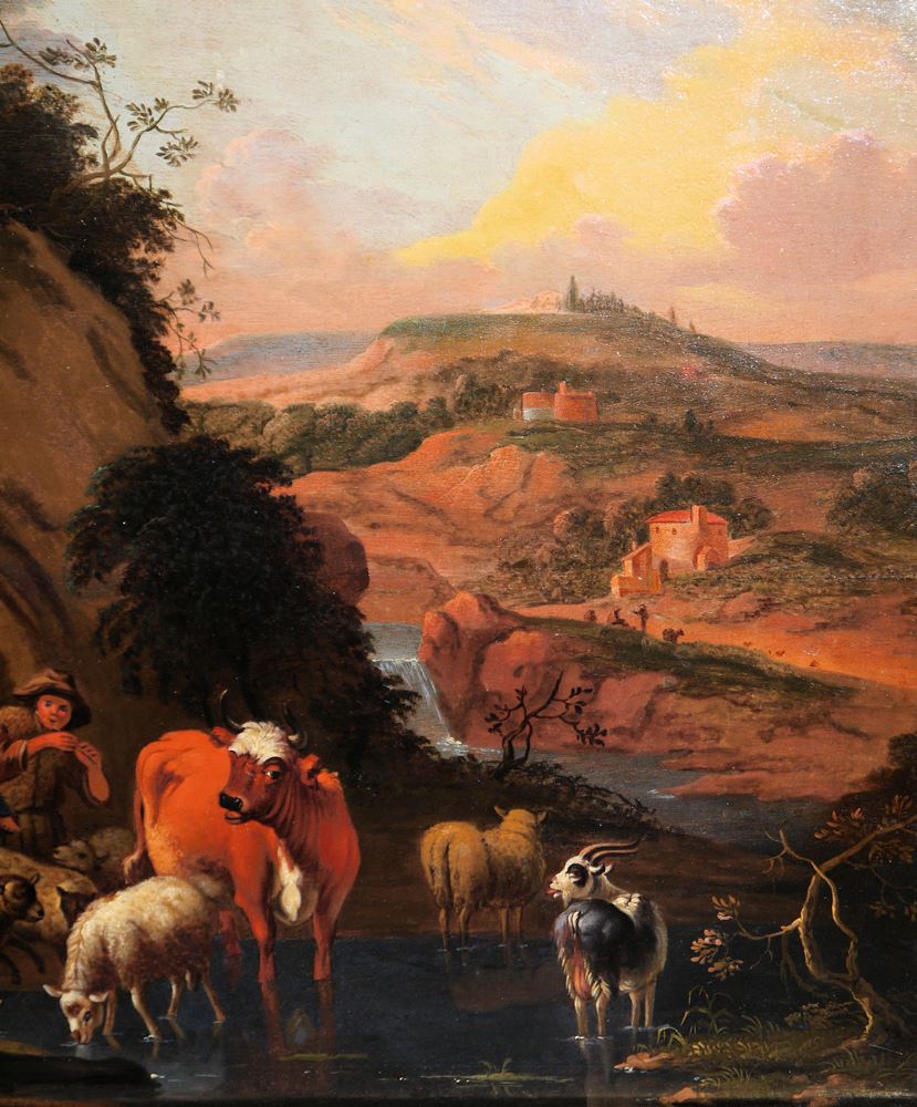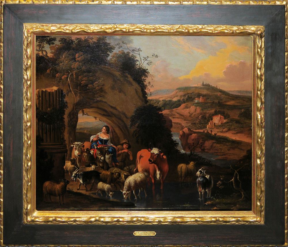 Nicolaes Berchem unsign. / zugeschr., Pastorale Ideal- Landschaft mit junger Hirtin und ihren Tieren, Ölgemälde um 1660, ansprechend gerahmt Nicolaes Pietersz. Berchem unsigniert / zugeschrieben, 1620 Haarlem - 1683 Amsterdam, niederländischer Maler, Zeichner und Graphiker, hier: Inmitten einer von Bäumen und Pflanzen überwucherten Felsformation mit vorgestellter antiker Säule sitzt eine jugendliche Hirtin mit tiefem Dekolleté, blauem Kleid und rotem Tuch, vom seitlich einfallenden Licht markant beleuchtet auf einem Esel. Neben ihr steht ein junger Hirte, der auf einer Flöte bläst. Um sie herum rasten zahlreiche Rinder, Ziegen und Schafe, zwei Jungtiere sind in einem Korb, der an ihrem Reittier befestigt ist. Nach rechts öffnet sich der Blick auf eine mediterrane Landschaft mit weiteren Personen und antiken Gebäuden. Die tiefe, warme Nachmittagssonne wirft lange Schatten. Mit solchen arkadischen Szenen wurde Nicolaes Berchem zu einem der führenden Maler italianisierender Landschaften, Öl auf gefaster und parkettierter Eichenplatte, 52 x 65 cm, professionell altrestauriert mit einigen Retuschen, meist entlang der mittig zweigeteilten Eichentafel, im geschmackvollen, gold-schwarzen Holzrahmen mit graviertem Künstlernamen auf poliertem Messingschild Zum Künstler: Nicolaes Berchem zählt zu den Hauptvertretern der niederländischen Landschaftsmalerei des 17. Jahrhunderts. Prägend für seine Malweise war der - wahrscheinliche - Aufenthalt in Italien. Seit dieser Zeit zeigen seine Zeichnungen und Gemälde arkadische Landschaften, von denen es unzählige Variationen gibt und bei denen eine sehr differenzierte und meisterliche Lichtbehandlung auffällt. Sein erster Lehrer war sein Vater, der Haarlemer Stillleben-Maler Pieter Claesz. Ausgebildet wurde er wahrscheinlich von Jan van Goyen, Jan Wils, Pieter de Grebber und Nicolaes Moeyaert. 1642 trat er in die Haarlemer Sankt-Lukasgilde ein.