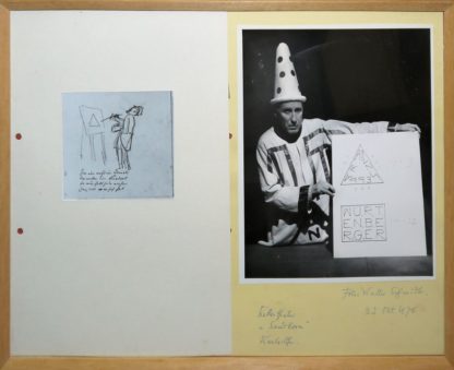 Franzsepp Würtenberger, Fastnachtkostüm aus einer Vorführung 1976 mit Fotomaterial Franzsepp Würtenberger, 1909 Zürich - 1998 Karlsruhe, deutscher Kunsthistoriker, Original- Fastnachtkostüm aus seiner "Akrobatischen Unterschriften" im Sandkorn-Theater anlässlich seines Abschieds als Hochschullehrer 1976, dabei Original-Fotographien von Würtenberger in seinem Kostüm, 3 x gerahmt Zum Künstler: Zunächst erwog er Maler zu werden, nahm dann aber ein Studium der Kunstgeschichte auf, 1930 in Freiburg, 1931 in Wien, 1931 in München. 1932 ging er wegen Erwin Panofsky nach Hamburg, 1932 studierte er in Karlsruhe, und bis 1935 wieder in Freiburg, wo er promovierte. 1937 erhielt er ein Stipendium an der Bibliotheca Hertziana in Rom. 1938 war er Assistent an die Universität Graz, wo er ab 1943 lehrte. Unter dem Eindruck des 1948 veröffentlichten Buches „Verlust der Mitte“ von Hans Sedlmayr begann Würtenberger einen neuen Anlauf zur wissenschaftlichen Arbeit. An der Außenstelle Freiburg der Staatlichen Akademie der Bildenden Künste Karlsruhe wurde Würtenberger 1949 Dozent und mitgegründete „fragmente-Gruppe“. 1951 kam Würtenberger an das Institut für Baugeschichte der Technischen Hochschule Karlsruhe, als dessen Direktor sein Freiburger Freund Arnold Tschira berufen worden war und wo er später außerplanmäßiger Professor wurde.