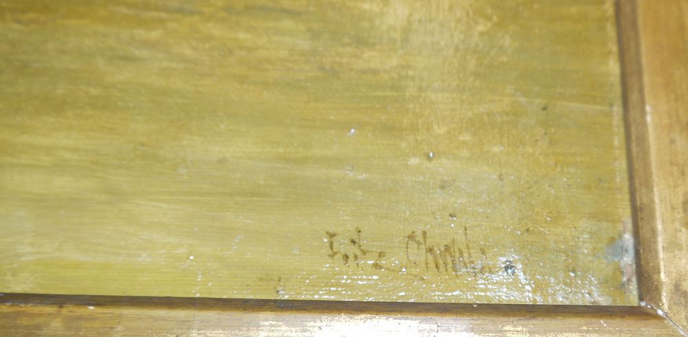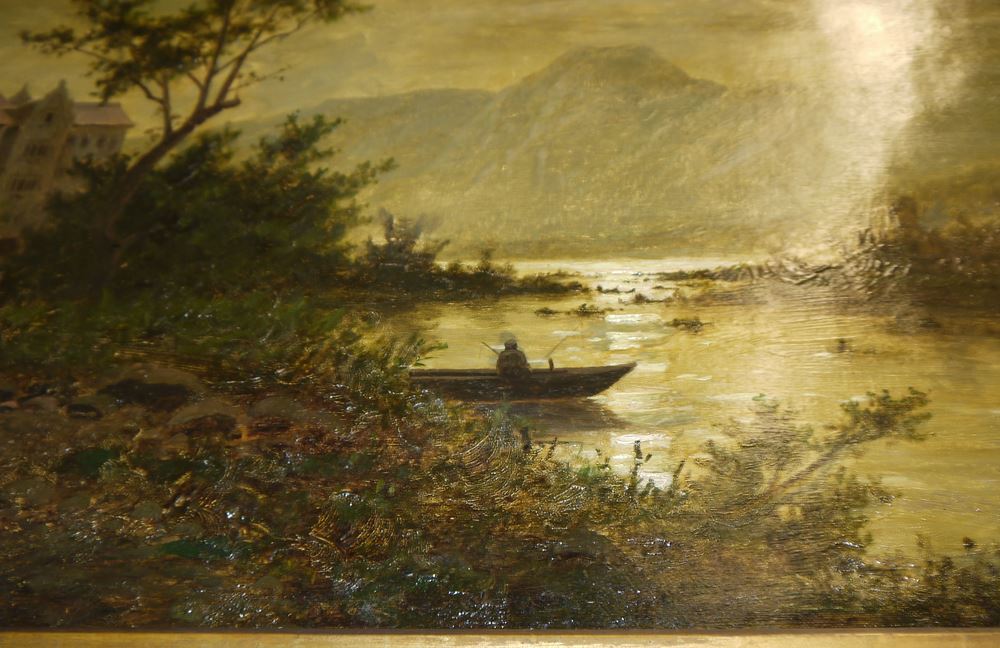 Fritz Chwala, Romantische Seenlandschaft bei Vollmond mit einem Schloss, größeres Ölgemälde um 1900 im wohl originalen Prachtstuckrahmen Friedrich Chwala,1872 - Wien - 1936, österreichischer Landschaftsmaler, hier: Vollmond über einem alpinen See, im Vordergrund ein Ruderboot mit einer Person, am Ufer ein stattliches Schloss, Öl/Lw., 50 x 82 cm, fachmänn. Altrestaurierung im unteren Drittel, r. u. sign., im wohl originalen Prachtstuckrahmen (Gesamt: 75 x 105cm) Zum Künstler: Fritz Chwala hatte ersten Malunterricht bei seinem Vater Adolf Chwala (1836-1900) und studierte anschließend an der Akademie der Bildenden Künste in Wien