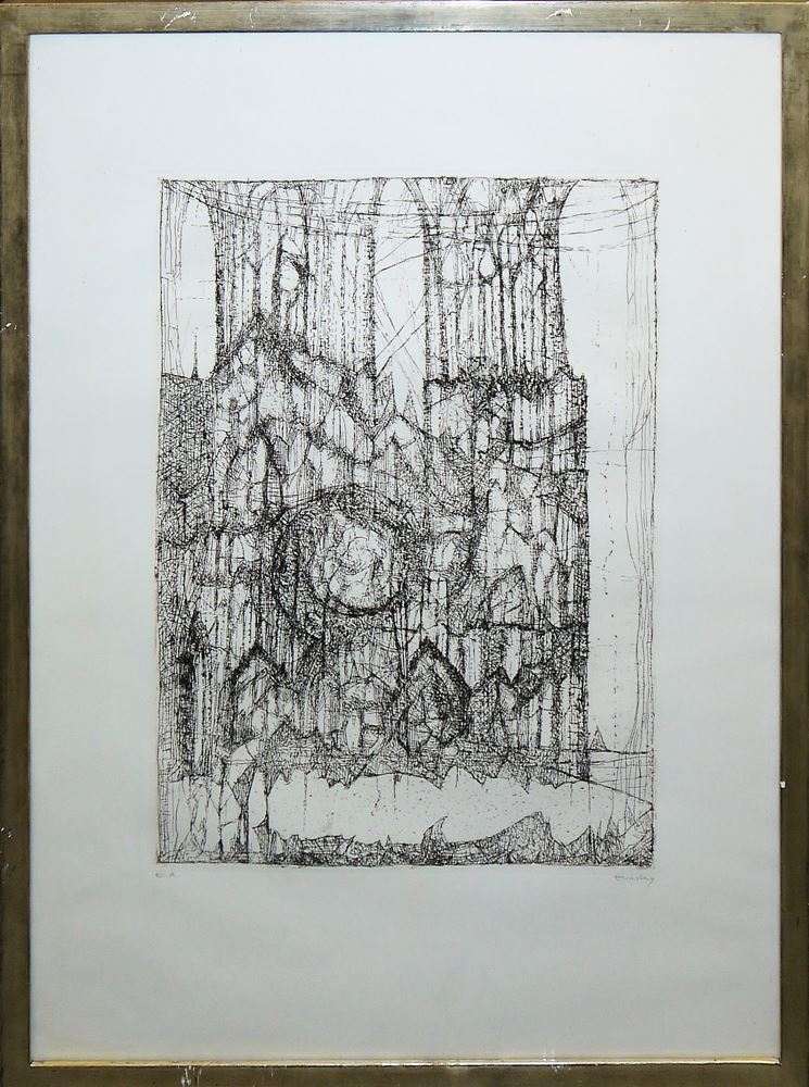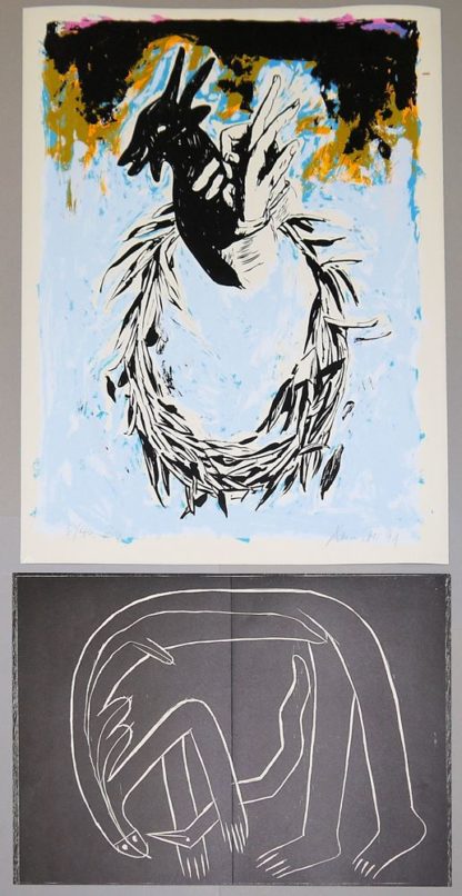 Hans Peter Adamski, *1947, "Ziege", Farbsiebdruck, 77 x 60 cm, 8/40, bez., sign. u. dat. 91 / Horst Antes, *1936, Figur, doppelseitiger Holzschnitt - Beilage im "Engel der Geschichte 25" von HAP Grieshaber, 42 x 60 cm / Tjorg Beer, *1973, Figurative Abstraktion auf Hellgelb, Radierung mit Silberfolie, 55 x 75 cm, sign. / Paul Eliasberg, 1907 - 1984, Kirche, Radierung, Radierung, 65 x 52 cm, E.A., sign., gerahmt / Jean Leppien, 1910 - 1991, "Trois cales inspendus" Farbige Dreiecke und Linien auf Hellgrau, Farbsiebdruck, 32 x 24 cm, 8/55, bez., sign. u. dat. 55