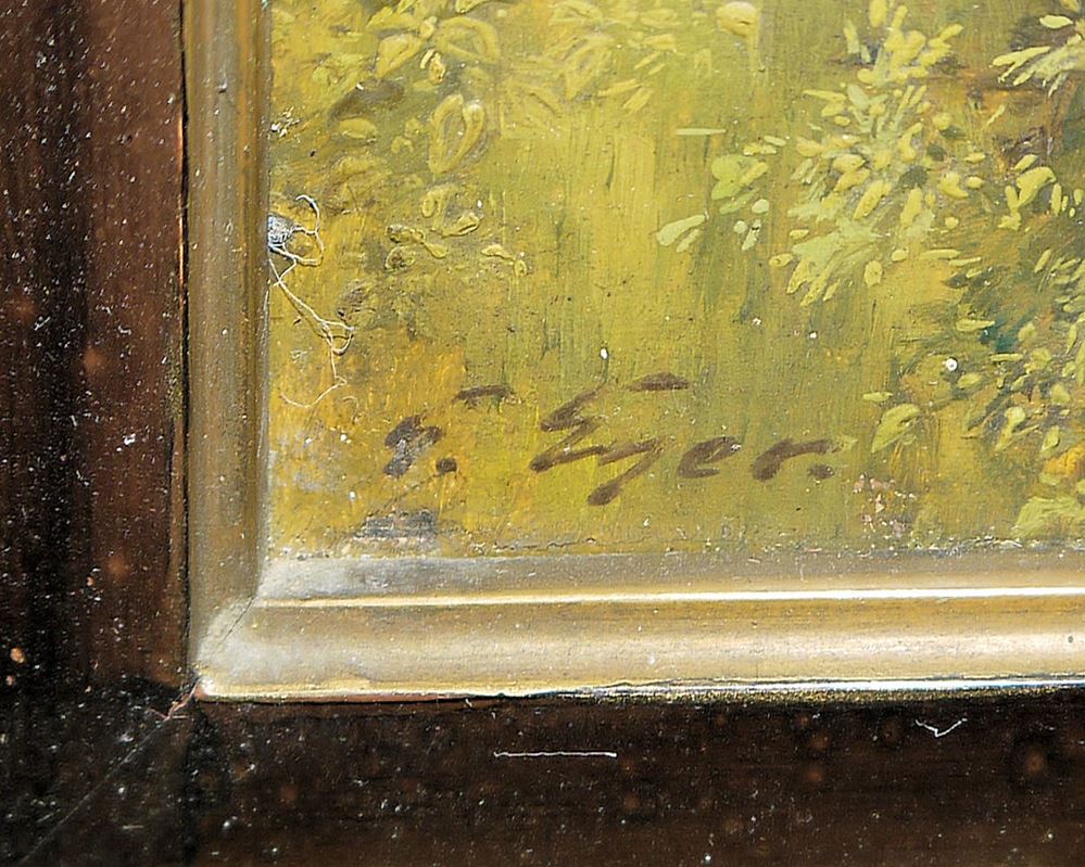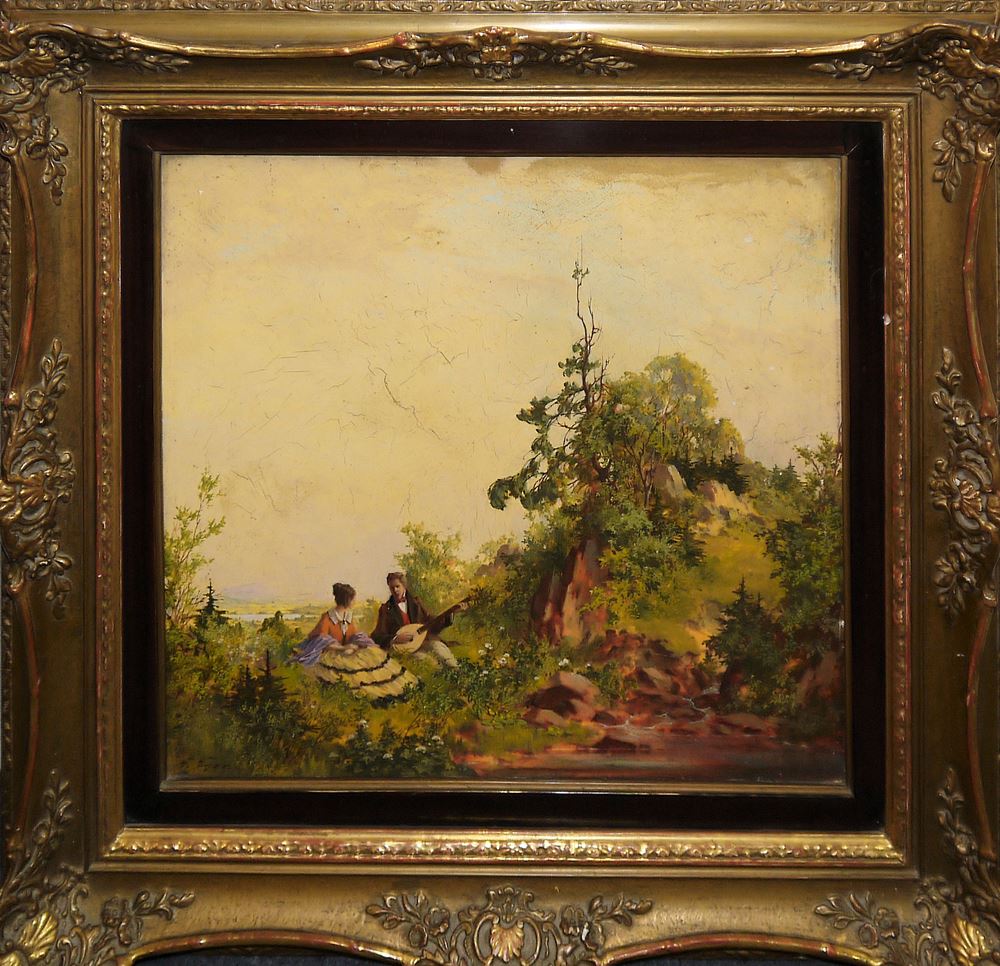 Gustav Eyer, 1887 Mollkirch, Frankreich - 1956 München, romantische Landschaft mit Liebespaar beim Lautespiel, Öl/Holz, 37,5 x 40 cm, u. li. sign., verso mit altem Galerieaufkleber von Hirrlinger Stuttgart u. bez. "Sonntag ists", minimale Farbabplatzungen u. Craquelé, im prachtvollen Goldstuckrahmen.