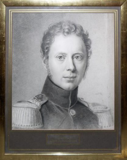 Königsporträtist um 1810: "Wilhelm I., König von Württemberg", Mischtechnik, gerahmt Wilhelm Friedrich Karl, 27. September 1781 in Lüben in Schlesien- 25. Juni 1864 in Cannstatt, 1816 -1864 als Wilhelm I. der zweite König von Württemberg, Brustbild Wilhelm I. in jungen Jahren in Uniform, Aquarell/Kohle, 42 x 39 cm, hinter geprägtem P.p. und Glas gerahmt, minimal Stockflecken, r. leichter vertikaler Knick