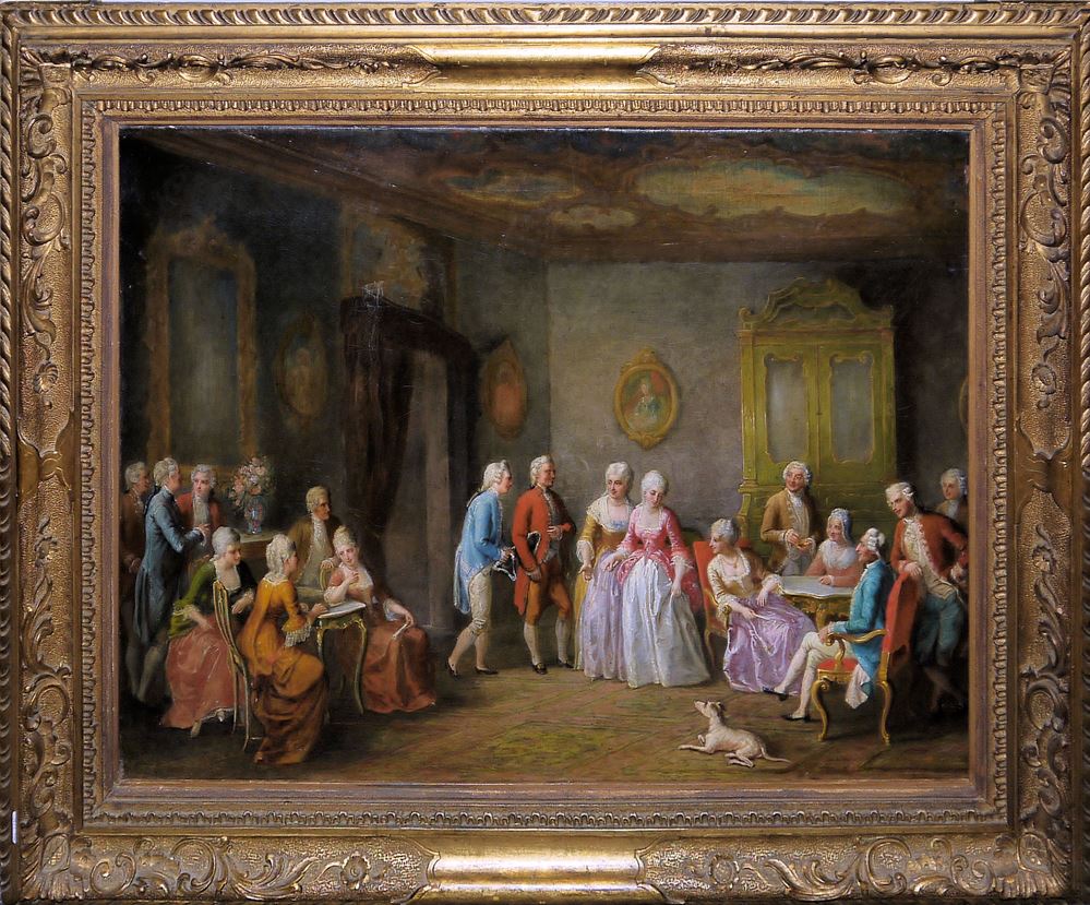 Félix Henri Giacomotti,1828 Quingey - 1909 Besançon, französischer Porträt- und Historienmaler italienischer Abstammung,hier: Elegante Rokokogesellschaft mit 17 Frauen und Männern in einem höfisch-prunkvollen Ambiente, Öl/Lw., 75 x 90 cm, guter Originalzustand mit wenigen Altersspuren und leuchtenden Farben, r. u. sign., im wohl originalen Goldstuckrahmen