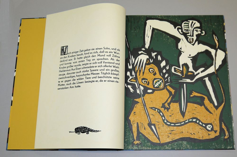 Klaus Süss, *1951 Crottendorf - lebt und arbeitet in Chemnitz, deutscher Künstler, hier: "Kholomodumo. Ein afrikanisches Märchen", 15 Doppelblatt mit 13 ( 2 doppelblattgroßen ) Original-Farbholzschnitten, 45,5 x 38 cm, als Blockbuch gebunden, mit einem Original- Farbholzschnitt illustr. Halbleineneinband, hinten numm. 84/100 & signiert, 17. Druck der burgart-presse Jens Henkel, Rudolstadt 1997, schönes, frisches Exemplar
