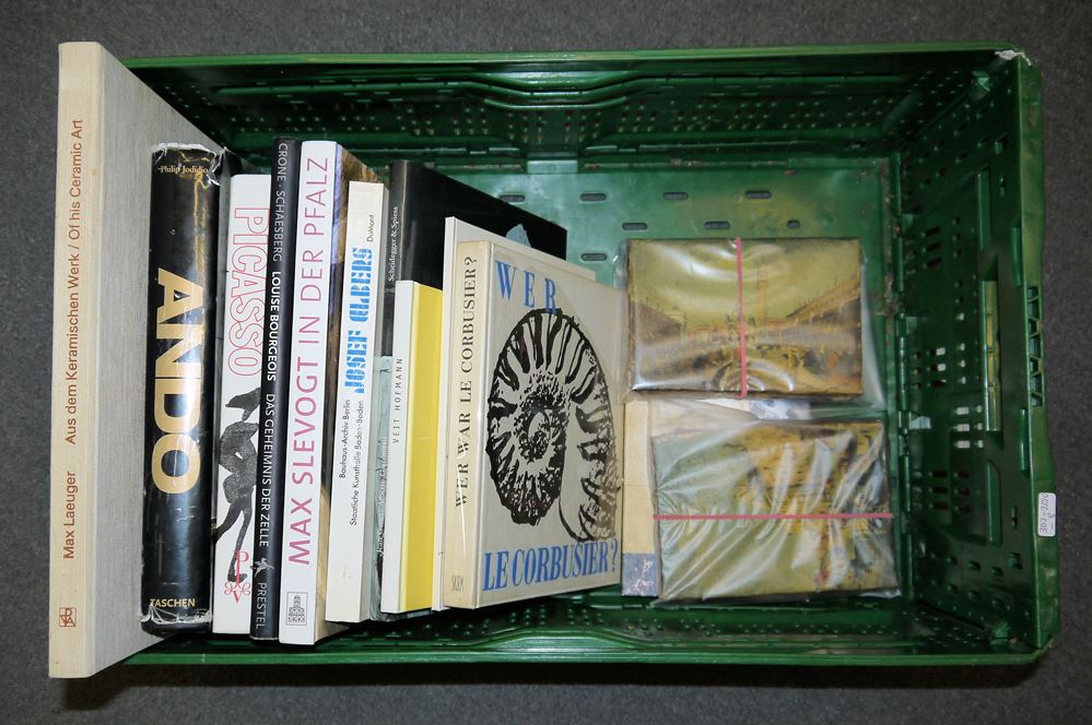 Nach Francesco Guardi (1712 - 1793), zwei frühe Venezia - Ansichten des 19. Jhs.: "La fondamenta dei Mendilanti" & "la Piazza S.- Marco", je 12 x 18 cm, verso bez. // Christel Abresch, 1931 Sulzbach/Saar - 2011 Neustadt/Weinstraße, Wolken über dem Meer, Aquarell, sign. & "Kähne", große Zeichnung, sign.u.dat. 75 // Manfred Jung, 1940 - 2021, 3 surreal-phantastische Farbradierungen, alle num. & sign. // Roger Bonnard, *1947 Rouen, "2 nues bleus", Farblitho 122/200, sign. u. dat. 89 / Monogrammist CK von 44, sign. Farbradierung "Tiger", gerahmt / Kunstbücher: Max Laeuger - Ceramic Art / Ando - Complete Works / Picasso - Druckgraphik, illustr. Bücher, Zeichnungen, Collagen u. Gemälde aus dem Sprengel Museum / Louise Bourgeois - Das Geheimnis der Zelle / Max Slevogt in der Pfalz / Josef Albers / Alberto Giacometti / Max Ackermann / Wer war Le Corbusier / sowie Kassette mit 10 Foto-Prints von Erwin Blumenfeld (Vogue Fotograf,1897 Berlin - 1969 Rom)
