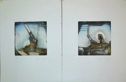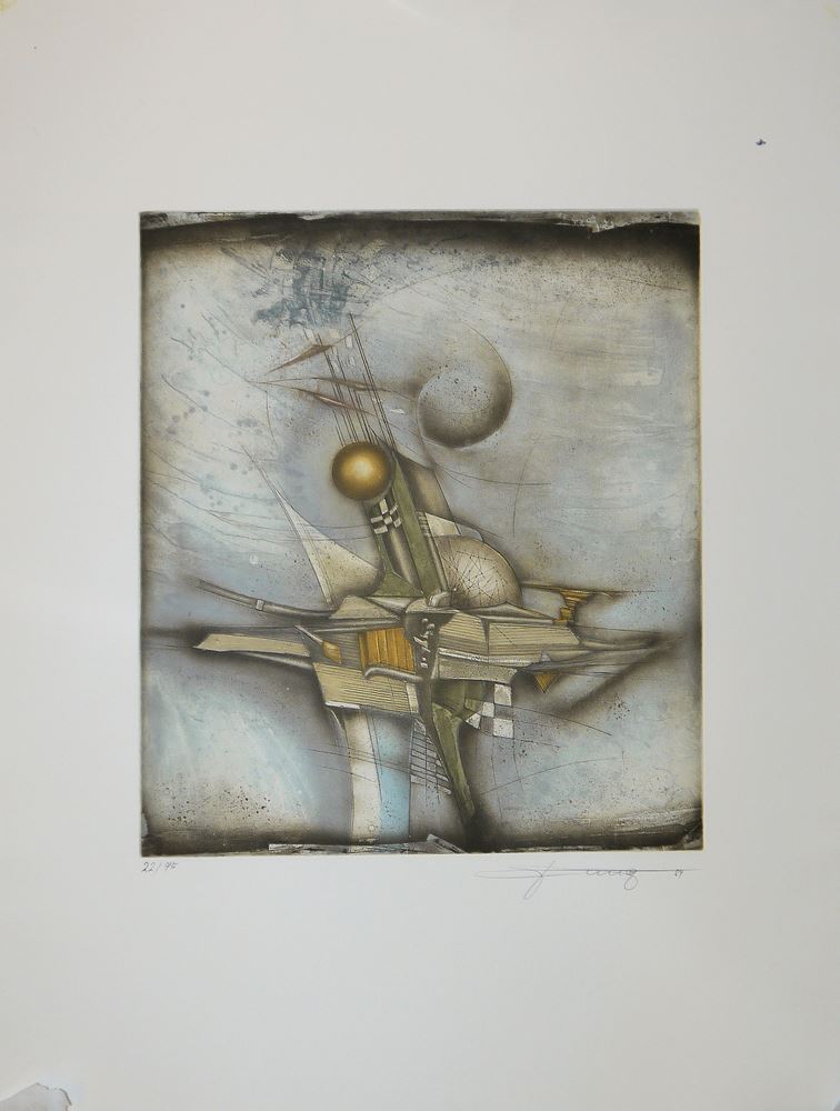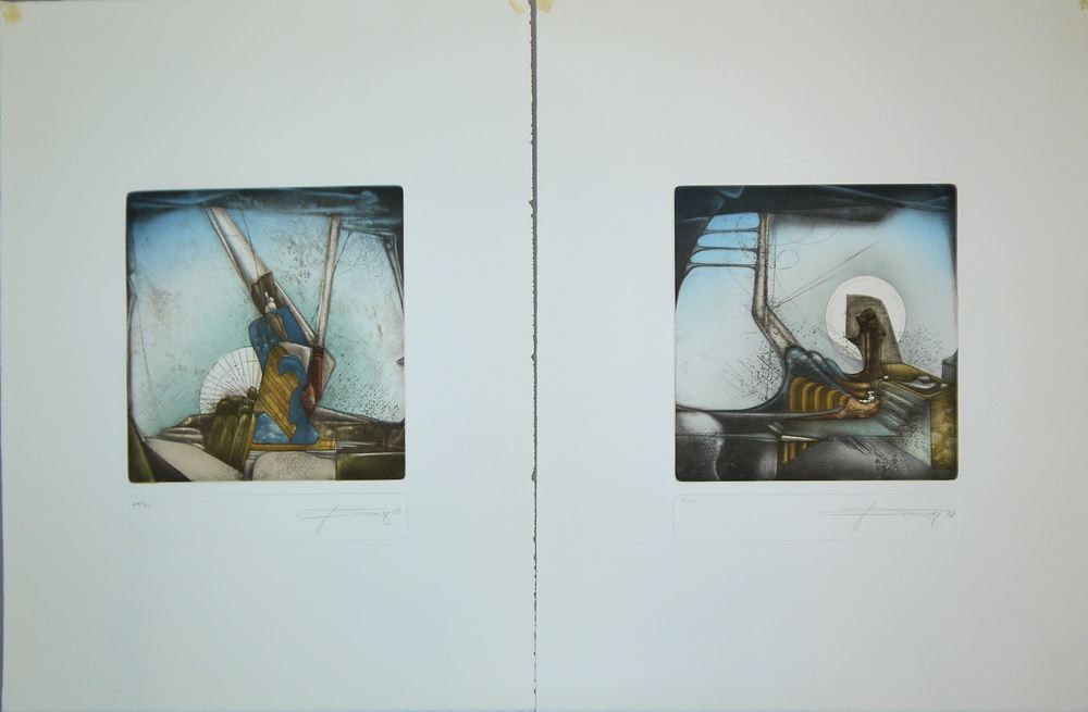 0466-Kunstgalerie-Nachlass: 2 kleine “Francesco Guardi” Venezia Ansichten des 19. Jhs. / 2 Originale von Christel Abresch / 3 sign. Farbradierungen von Manfred Jung / Farblitho von Roger Bonnard, 10 interessante Kunstbücher (Picasso, Josef Albers u.a.)