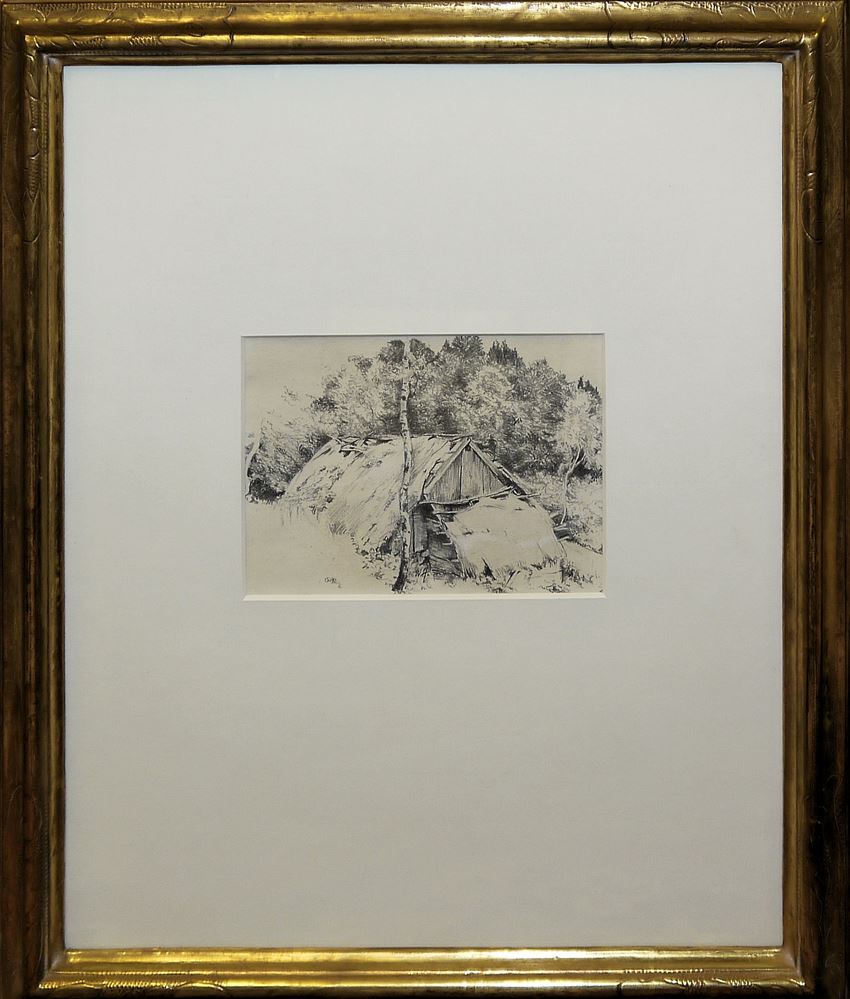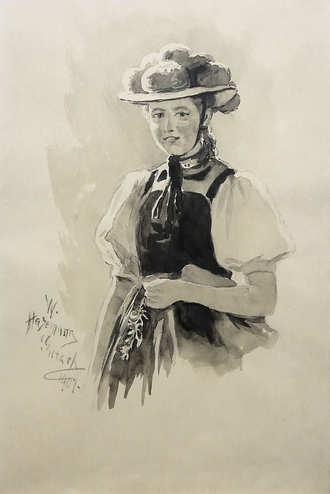 Wilhelm Gustav F. Hasemann, 1850 Mühlberg/Elbe -1913 Gutach, Landschafts- und Genremaler und Illustrator, der als „Schwarzwaldmaler“ bekannt wurde, hier: Bildnis eines Mädchens in Schwarzwald-Tracht, Grisaille-Aquarell, ca. 19 x 12 cm, sign., dat. u. bez. Gutach; Landschaft mit Hütte und Bäumen, Bleistiftzeichnung, 14 x 20 cm, beide hinter P.p. und Glas in schönen Goldstuckrahmen
