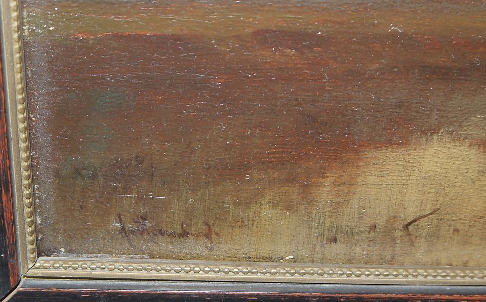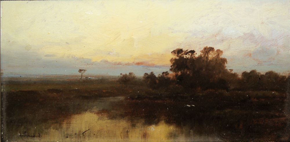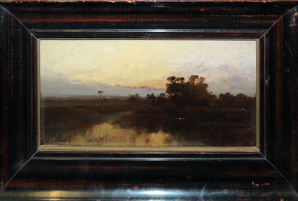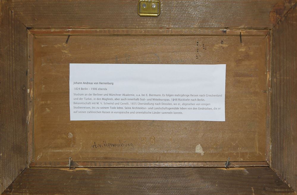 Andreas von Herrenburg, Flusslandschaft nach Sonnenuntergang, Ölgemälde, gerahmt Johann Andreas von Herrenburg, 1824 Berlin -1906 ebenda, Architektur-, Landschafts- sowie Maler des Orients, Abendstimmung in einer Ebene mit baumbestandenem Flussverlauf (Griechenland?), stimmungsvolles Öl/Holz, 13 x 26 cm, sign., im Holzrahmen der Zeit mit Goldinnenleiste Zum Künstler: Herrenburg erhielt den ersten Unterricht vom Landschaftsmaler Professor Karl Eduard Biermann und machte dann zu seiner weiteren Ausbildung Studienreisen durch Deutschland, Frankreich und Italien. Als er 1845 auch nach Athen kam, bewog ihn König Otto I. von Griechenland, die Denkmäler des Altertums auf dem Peloponnes zu erforschen. Von dort aus begleitete er eine Expedition nach Kleinasien, Palästina und Persien. Nachdem er noch Ägypten, Nubien und Abessinien bereist hatte, kehrte er 1848 nach Berlin zurück und führte seine zahlreichen Skizzen zu landschaftlichen und Architekturbildern aus.