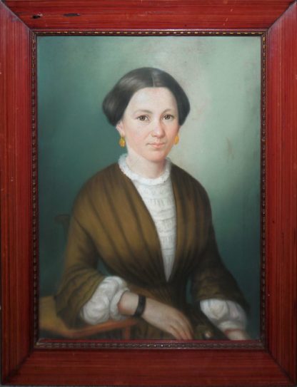 Eine junge Frau mit gescheitelten, langen Haaren, elegant gekleidet und geschmückt mit schönen Ohrringen, sitz an einem Tisch und schaut den Betrachter mit warmen, braunen Augen an. Pastell, 35 x 30 cm, in alter rotbrauner Rahmung