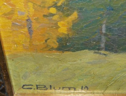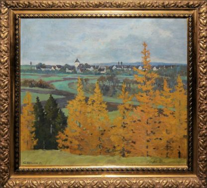 Carl Blum, Rosenfeld im Breisgau, Ölgemälde von 1919 im originalen Goldstuckrahmen Carl Blum, 1888 Freiburg - 1953 Balingen, deutscher Maler, hier: Blick durch herbstliche Bäume auf das Städtchen Rosenfeld, zu dem es den Künstler immer wieder hinzog, er dort gerne die Sommermonate verbrachte und in dem er zwischen 1930 und 1940 lebte und arbeitete. (Rosenfeld liegt zwischen Balingen und Oberndorf am Neckar, etwa 60 Kilometer südlich von Stuttgart im Zollernalbkreis in Baden-Württemberg), Öl/ Lw., 72 x 82 cm, l. u. sign. u. dat. 19, im originalen, gut erhaltenen Goldstuckrahmen Zum Künstler: Carl Blum studierte an der Großherzoglich-Badischen Akademie der Bildenden Künste Karlsruhe bei Hans Thoma, Wilhelm Trübner und Ludwig Dill. In seiner charakteristischen grafischen Handschrift, die sich schon in seiner Signatur äußert, gestaltete Blum menschenleere Landschaften. Seine Bilder zeichnen sich durch einen freiheitlichen Umgang mit der Naturvorgabe aus und gehen als freie Kompositionen über die realistische Wiedergabe hinaus.
