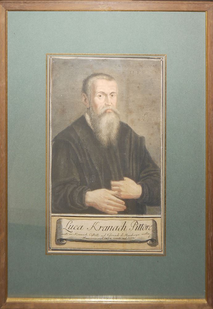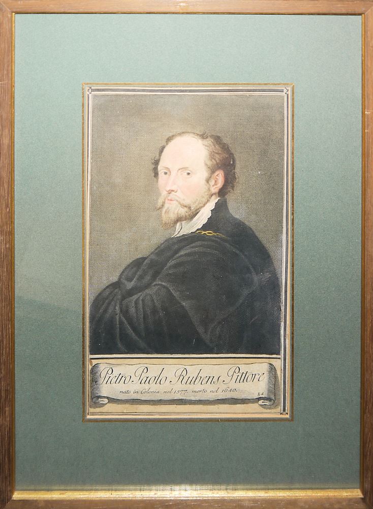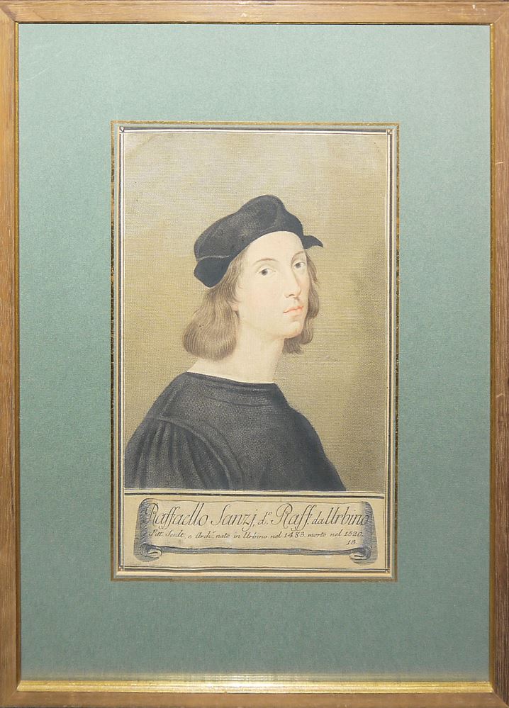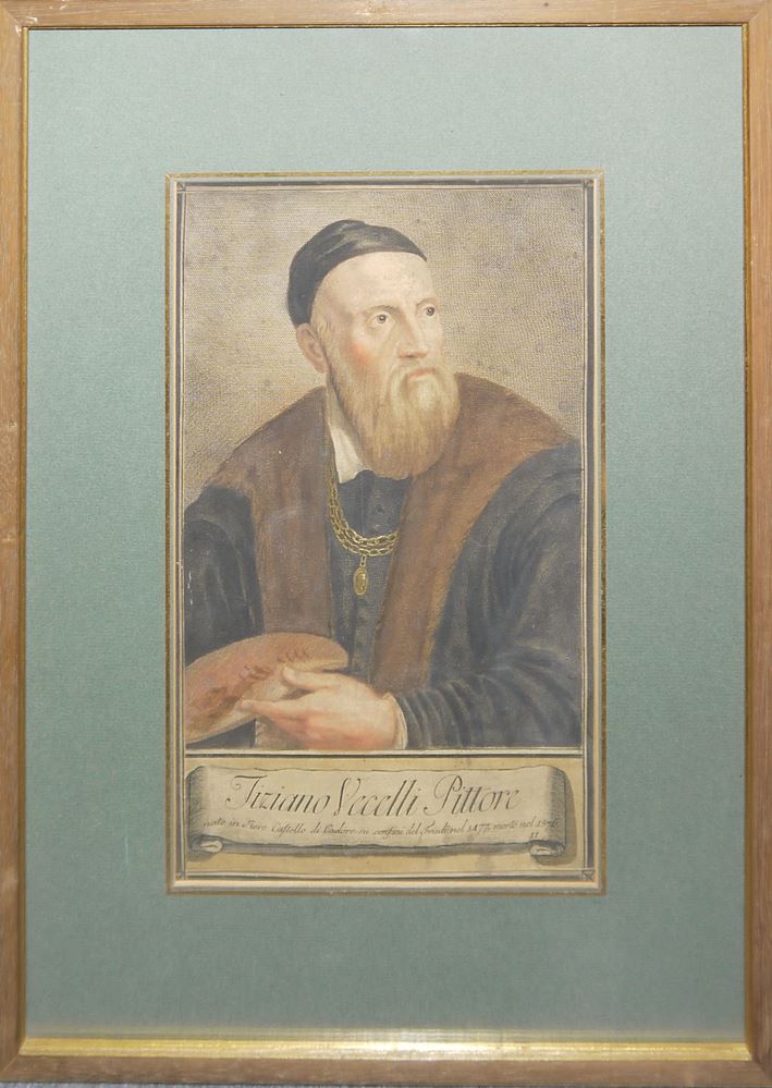 Graf Carlo Lasinio, 1759 Treviso - 1838 Pisa, italienischer Zeichner, Radierer und Kupferstecher, der überwiegend in Florenz arbeitete, hier: 4 Halbporträts der berühmten Maler Tizian, Raffael, Lucas Cranach und Peter Paul Rubens aus (dalla serie): "Ritratti originali di pittori esistenti nella Reale Galleria di Firenze", von 1791/96, handkolorierte Schabkunstblätter (Mezzotinto), je 28,5 x 18,5 cm, alle unter gold-grünen P.partouts gleich gerahmt, Gesamt: je 44,5 x 33,0 cm