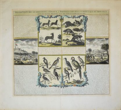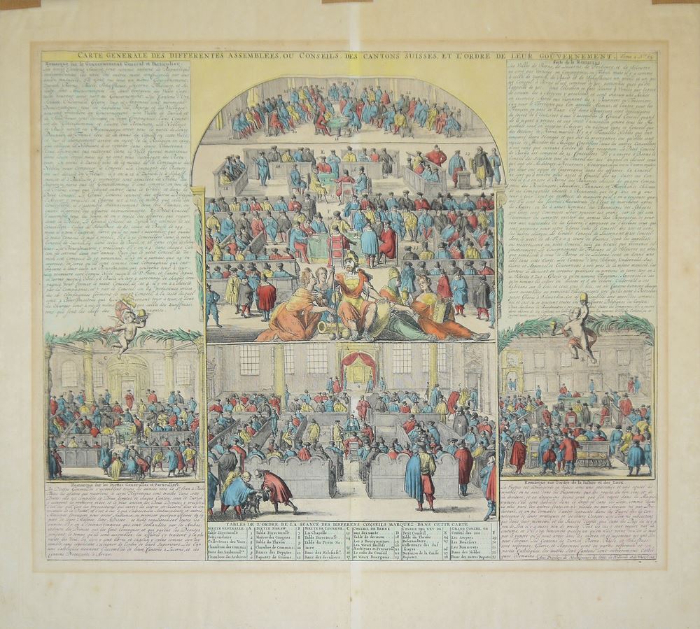 Henri Abraham Chatelain, 2 Kupferstiche aus Atlas Historique Henri Abraham Chatelain, 1684-1743, niederländische Kartograf und hugenottischer Pastor Pariser Herkunft, lebte in Paris, St. Martins, London (um 1710), Den Haag (um 1721) und Amsterdam (um 1728), hier: "Description des quadrupedes, oiseaux & reptiles les plus curieux qui se trouvent dans la guinée dessinez sur les lieux d'apres le naturel", Kupferstich aus: Atlas Historique, Amsterdam zwischen 1705 und 1720, koloriert, 38 x 43 cm und "Carte Générale des différentes assemblées ou conseils des cantons suisses, et l'ordre de leur gouvernment", Kupferstich aus: Atlas Historique, 1719, koloriert, 36 x 45 cm, die Tafeln zeigen die Generalversammlung, die Versammlungen in Aarau, Luzern, Bern, sowie den Rat der 25 und den Rat der 200