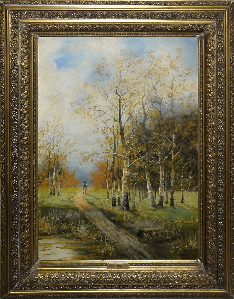 Rose Gertrud Hildegard Lehnert, 1857 - Berlin - 1943, deutsche Malerin & Fotografin, hier: Herbstlicher Birkenwald mit einem Bach; auf einem schmalen Weg ein Mann in Rückenansicht, der ein Gewehr geschultert hat. Öl/Platte, 90 x 65 cm, r. u. sign., im originalem Goldstuckrahmen (Gesamt: 115 x 90 cm) mit graviertem Namensschild