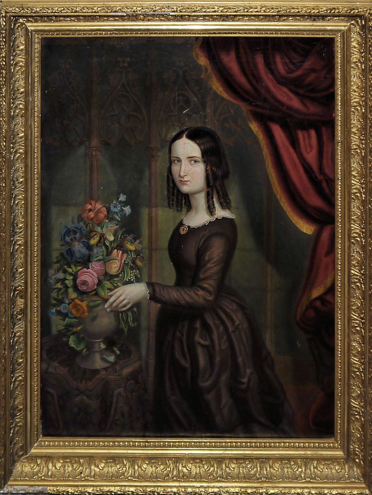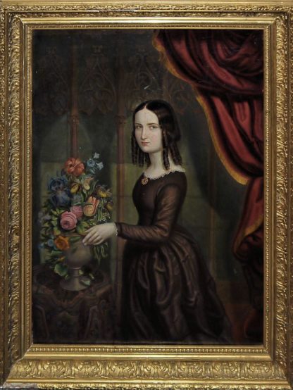 Carl Fiebig, 1812 Eckernförde - 1874 Kopenhagen, zugeschr., hier: In einem prächtigen Innenraum mit gotischem Maßwerk steht eine junge Frau mit gedrehten Locken vor einer Vase mit einem Blumenstrauß, Öl/Lw., doubliert, 52 x 38 cm, im Goldstuckrahmen