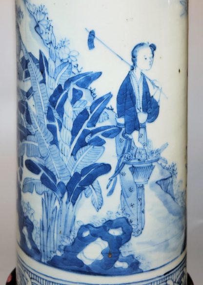 Ensemble aus drei Blauweiß-Vasen in Baluster- und Gu-Form ohne Nodus, detailreich bemalt mit zwei Unsterblichen am Tisch und einer Dienerin, umrahmt von einer idealen Waldlandschaft, bis auf sehr wenige Randchips alle Vasen und Deckel intakt, Böden ungemarkt, aber mit Etiketten des renommierten niederländischen Antikhandels Limburg in Brouwershaven, H ohne Holzsockel 45 & 46 cm