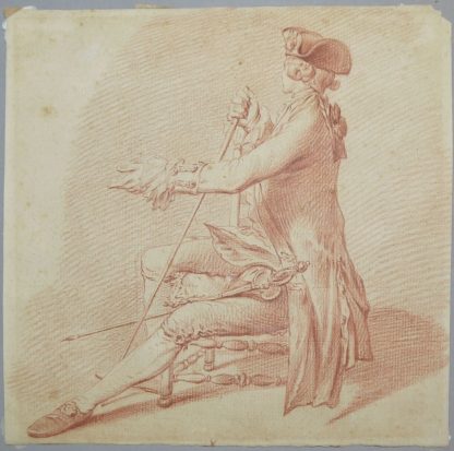 Französischer Meisterzeichner des 18. Jhs., Louis-Marin Bonnet zugeschr. 1731, 1736 oder 1743 - Paris - 1793 , französischer Maler und Kupferstecher des Rokoko, hier: Ein junger, elegant gekleideter Kavalier mit umgürteten Degen sitzt mit abgewandtem Gesicht auf einem Stuhl, in der rechten Hand einen Stock haltend, die linke Hand ausgestreckt, Rötel auf Bütten mit aufwändigem Wasserzeichen, 21x21 cm.