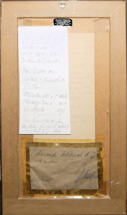 Eduard Schleich der Jüngere, 1853 München - 1893 ebenda, deutscher Landschaftsmaler. Stilistisch gehört er zu den späten Vertretern der Freilichtmalerei, die sich ab den 1890er Jahren dem Impressionismus zuwandten, hier: Blick durch Bäume über den Starnberger See auf die Alpen, Öl/Karton, 26 x 14 cm, verso div. ältere handschriftliche Zettel: "Eduard Schleich d. J. 1948 erworben - Karl von Piloty" / "Am Starnberger See, von Vater für mich gekauft , Ed. Schleich d. J., 1948", ältere, ungeöffnete Rahmung