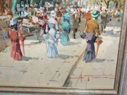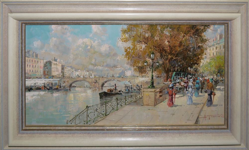 Antonio Gravina, 1934 - Neapel - 2011, hier: Ein Sommertag um 1900 in Paris. Elegant gekleidete Frauen und Männer flanieren entlang der Stände der Bouquinisten an der Seine, Öl/Lw., 60 x 30 cm, r. u. sign., verso nochmals sign. u. handschriftl. bez., in Galerierahmung