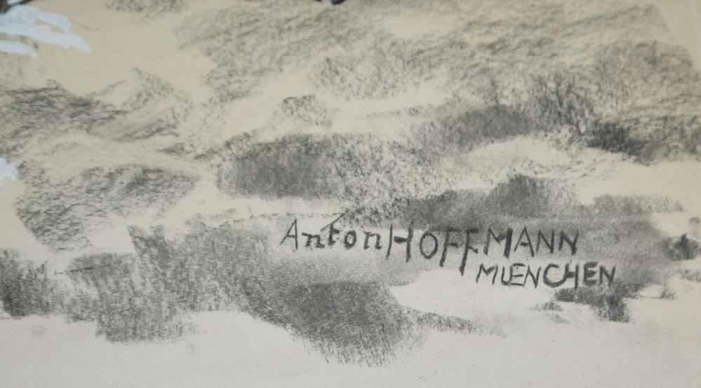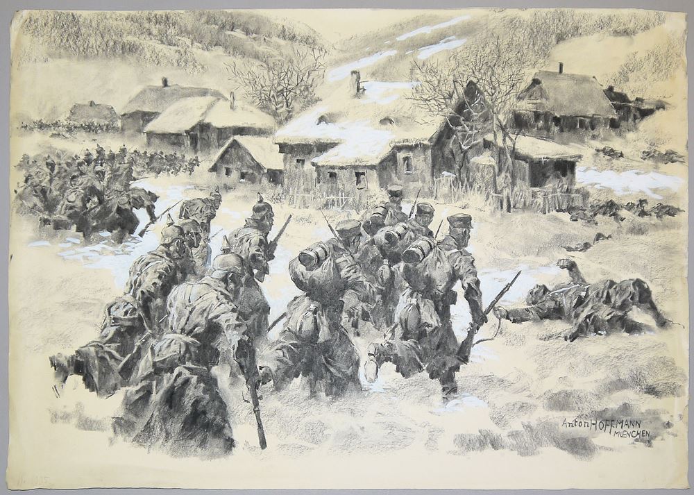 Anton Hoffmann, Sturm auf ein Dorf im Ersten Weltkrieg, Kohlezeichnung Anton Hoffmann, 1863 Bayreuth - 1938 Rothenburg ob der Tauber, Eine große Truppe Infanterie prescht schnellen Schrittes auf ein winterliches Dorf zu, Kohle/Weißhöhe/Karton, 54,5 x 80 cm, signiert, bezeichnet Muenchen, Kanten etwas bestoßen, o. Rahmen Zum Künstler: 1889-1995 Studium an der Kunstakademie München bei Gabriel von Hackl und Wilhelm von Diez; Ab 1986 stellte er regelmäßig im Glaspalast aus. Als Maler zeigte er sich als treuer Diez-Schüler und legte seinen Schwerpunkt auf die Historien- und Militärmalerei. Als Heereskundler zeichnete Hoffmann insbesondere mehrere Serien zur Uniformgeschichte des Bayerischen Heeres. Daneben schuf er als Mitglied des Süddeutschen Illustratorenbundes auch zahlreiche Illustrationen für Schulbücher, Jugendschriften, Geschichtsbücher, die Fliegenden Blätter. Auch für Karl Mays im Regensburger Marien-Kalender 1899 erschienene Erzählung Die Umm ed Dschamahl fertigte er fünf Autotypien.