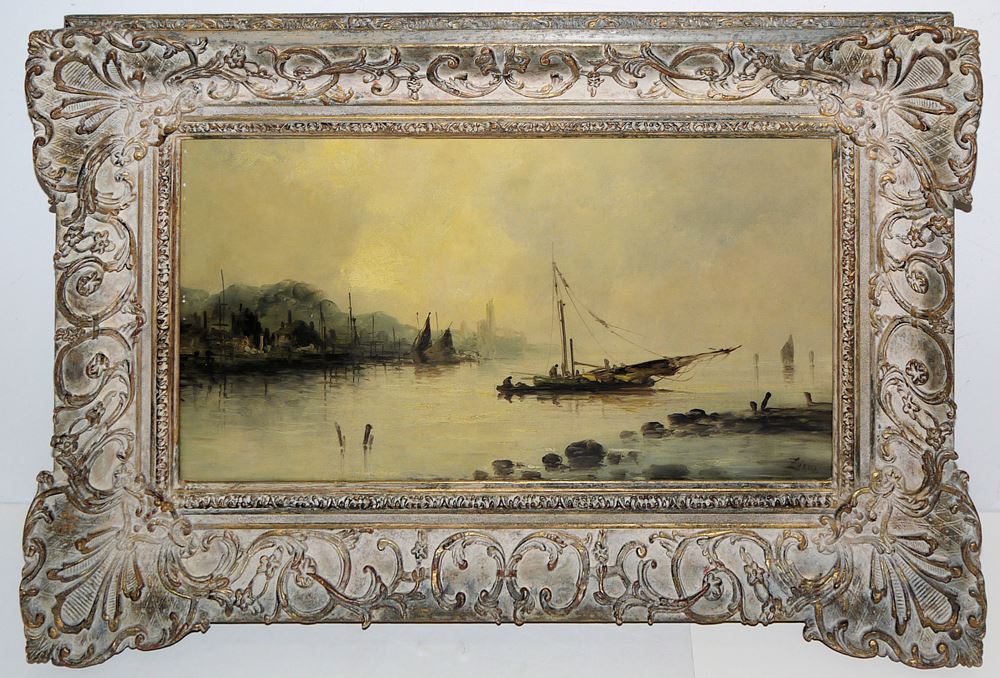 Félix-Francois Georges Philibert Ziem, signiert oder bezeichnet, 1821 Beaune- 1911 Paris, Maler der Schule von Barbizon, Blick auf einem Hafen mit Booten bei diesigem Wetter, Öl/Lw., dubliert, 35 x 65,5 cm, im Prachtrahmen