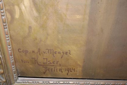 Heinrich Iser, 1869 Reischsdorf/Preßnitz -1932 Berlin, deutscher "Hofbildnismaler", großes Porträt "Friedrich des Großen" nach Adolf Menzel, Öl/ Lw., 125 x 100 cm, l. u. sign., bez. u. dat. 1924, im restaurationswürdigen, originalen Goldstuckrahmen mit plastischer Preussischer Kaiserkrone, Gesamt: 160 x 120 cm