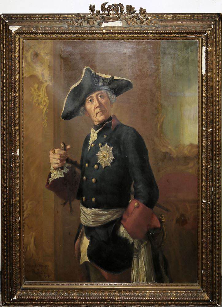 Heinrich Iser, Friedrich der Große, großes Gemälde aus Adelsnachlass, im originalen Goldstuckrahmen mit plastischer Preussischer Kaiserkrone (rest.würdig)