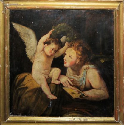 Italienische Schule um 1700, "Allegorie der Malerei", Ölgemälde, unberührter Speicherfund, alt gerahmt Anonym um 1700, Guido Reni/ Francesco Gessi Nachfolge: Der Genius der Kunst in Form eines geflügelten Putto, krönt mit einem Lorbeerkranz die Malkunst, die als junge Frau mit einer Malerpalette, dargestellt ist, Öl auf schwerer, parkettierter Holzplatte, alt gerahmt, Gesamt: 72 x 70 cm Das vorliegende Gemälde greift ein Motiv auf, das Guido Reni (1575 -Bologna- 1642) bzw. Francesco Gessi (1588 -Bologna-1649) zugeschrieben wird. Es handelt sich jedoch nicht um eine Kopie, sondern um eine eigenständige Interpretation mit klarem Bezug zum Vorbild, heute im "Royal Collection Trust", London.