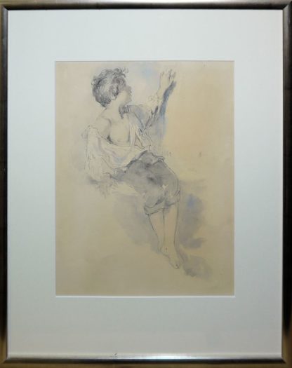 Italienischer Meister um 1900, Vor einer imaginären, weißen Hauswand sitzt ein Knabe mit offenem Hemd und kurzen Hosen auf einer imaginären Bank und betrachtet aufmerksam das Schattenspiel der Finger seiner linken Hand, Aquarell über Bleistift, ca. 30 x 25 cm, unter P.partout gerahmt (Gesamt: 46 x 40 cm)