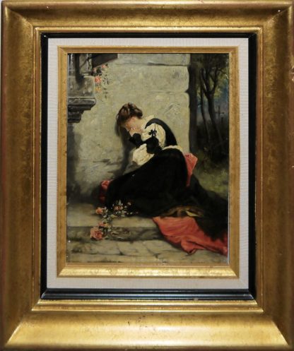 Janssen, wohl Ludvig Luplau Janssen, Trauernde junge Frau , symbolistisches Ölgemälde um 1900, gerahmt Ludvig Luplau Janssen, 1869 Sørbymagle - 1927, dänischer Landschafts- u. Genremaler, hier: An der Wand einer steinernen Architektur - ein Kreuz im Hintergrund assoziiert einen Friedhof - kniet eine junge, elegant gekleidete Frau. Neben und über sich hat sie Rosen abgelegt, die eine zweite Ebene, nämlich eine verlorene Liebe, symbolisieren, Öl/Holz, 24 x 18cm, r. u. sign., gerahmt Zum Künstler: 1887, mit 18 Jahren, begann Janssen seine Ausbildung an der Königlich Dänischen Kunstakademie in Kopenhagen. Neben seinem dortigen, traditionellen Unterricht besuchte Abendkurse an PS Kroyers Malschule, die deutlich fortschrittlicher war. Kroyer, der kurz zuvor in Paris gelebt hatte, studierte bei Léon Bonnat und verkehrte mit den Impressionisten. Sein Ansatz war freier, liberaler und konzentrierte sich auf die flüchtigen Effekte des Lichts. Schon drei Jahre später, im Jahre 1890, debütierte Janssen auf der renommierten Charlottenborger Frühjahrsausstellung mit großem Erfolg, woraufhin er 1894, 1896 und 1898 ausgezeichnet wurde.