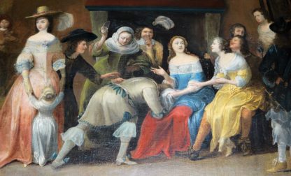 Hieronymus Janssens, auch „Den Danser“, 1624 - Antwerpen - 1693, flämischer Maler des goldenen Zeitalters, zugeschrieben hier: In einem hohen Innenraum hat sich eine elegante Gesellschaft um einen Mann herum versammelt, der seinen Kopf in ein Tuch gelegt hat, das eine junge Frau in ihrer Linken hält. Von zwei weiteren Personen wird er dabei auf den Rücken geschlagen. Es handelt sich hierbei um das Gesellschaftsspiel "la main chaude", bei dem es zu erraten gilt, wessen Hand geschlagen hat. Qualitätvolle, detailreiche Malerei mit vielen Details, bei der die Gesichter und das Inkarnat der Damen durch helle Beleuchtung besonders hervorgehoben ist, Öl/ Lw., altdoubliert,47 x 63 cm, zwei Drittel des unteren Randes retuschiert, möglicherweise befand sich dort die Signatur, gerahmt mit graviertem Namensschild.